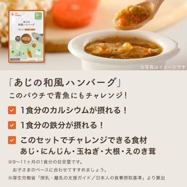 [ 3種の 離乳食 セット内容 ]< あじ の 和風ハンバーグ >< ツナ と ほうれん草 の 豆乳 クリーム パスタ >< 豚肉 と 野菜 の 五目 うま煮 >各2袋ずつの計6袋を『 9ヶ月 離乳食 6袋セットB』にしました。奥の歯茎を使って食べ物をかむ練習をする時期の 赤ちゃん 。「もぐもぐ」「ごっくん」が上手になって食べられる食材が増えてきたら、少し歯ごたえのある固さにしてみましょう。