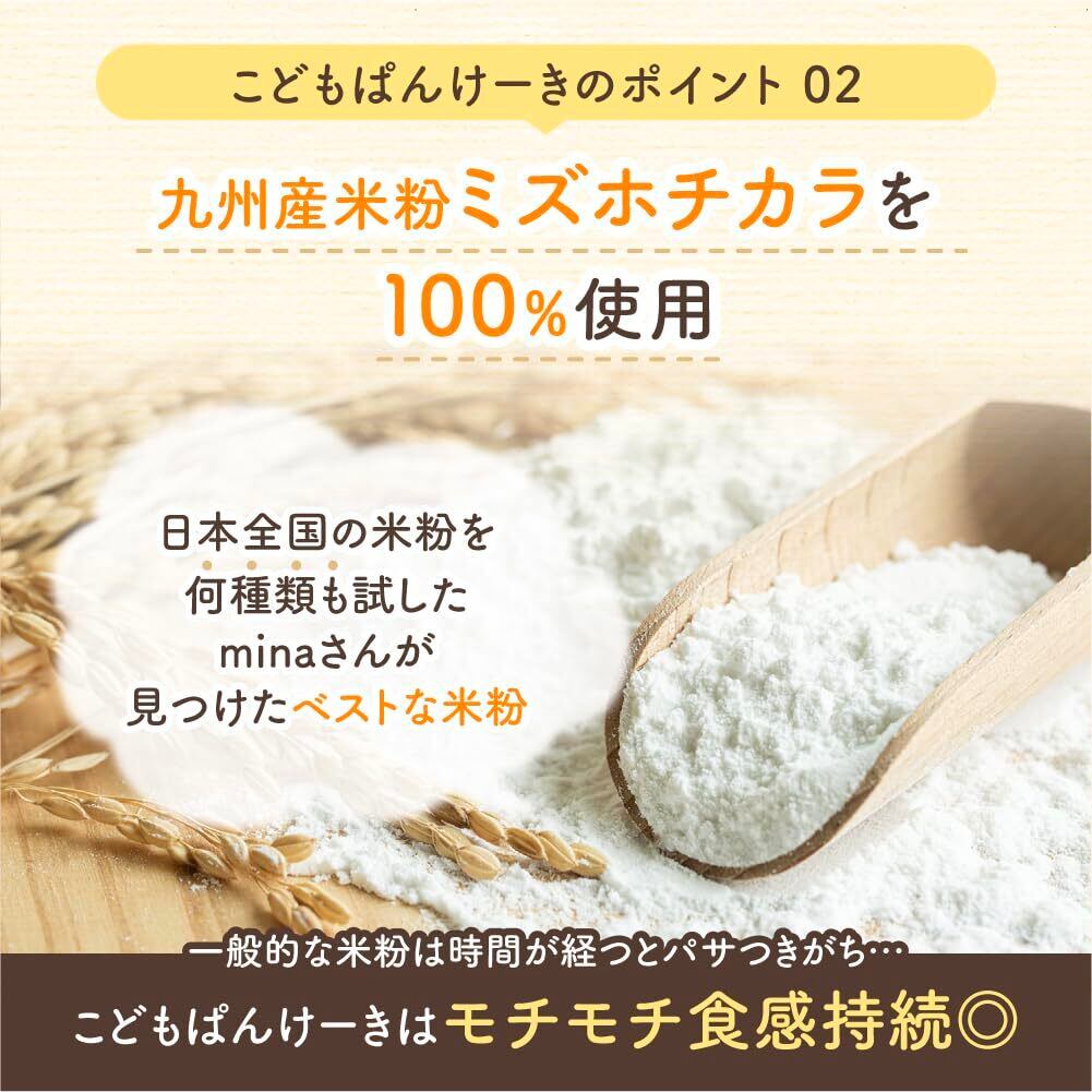 【 モチモチ食感が持続】 九州産米粉「ミズホチカラ」を100%使用!日本全国の米粉を何種類も試したminaさんが見つけたベストな米粉です。一般的な米粉は時間が経つとパサつきがちですが、こどもぱんけーきはモチモチ食感が持続します。冷凍してもモチモチ食感はそのまま