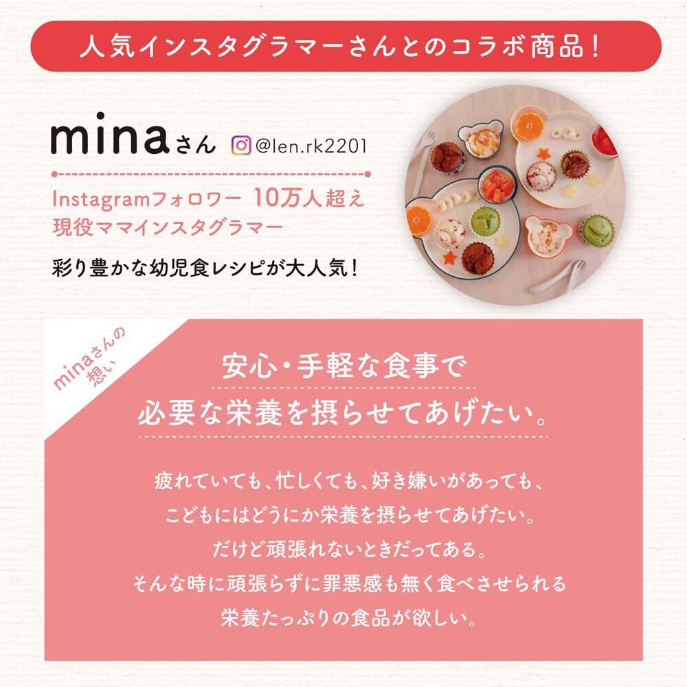 【Instagramフォロワー10万人越え 人気インスタグラマーminaさんとのコラボ商品】 「疲れていても、忙しくても、好き嫌いがあっても、こどもにはどうにか栄養を摂らせてあげたい。だけど頑張れないときだってある。そんな時に頑張らずに罪悪感も無く食べさせられる栄養たっぷりの食品が欲しい。」そんなminaさんの想いが詰まった商品です。