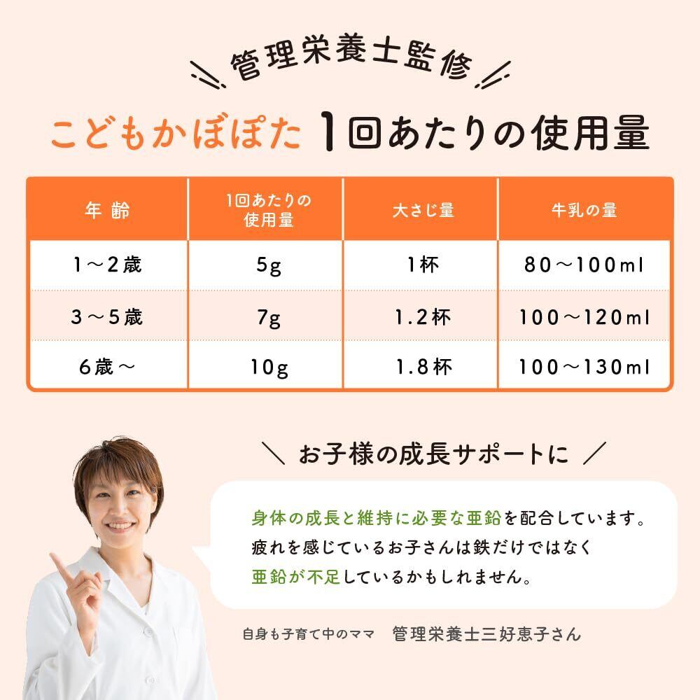 【育ちざかりをサポート】 急な成長で沢山必要な鉄分と、体の成長や免疫を支える必須ミネラルの亜鉛を強化し、こどもかぼぽた1杯で1/2日分を補うことができます。栄養素の量を食材に換算すると、3~5歳の1杯分の場合、鉄分はほうれん草1.3束分、亜鉛は卵3.6個分、カリウムはブロッコリー3房分!(本品7gと牛乳100mlで飲んだ場合)