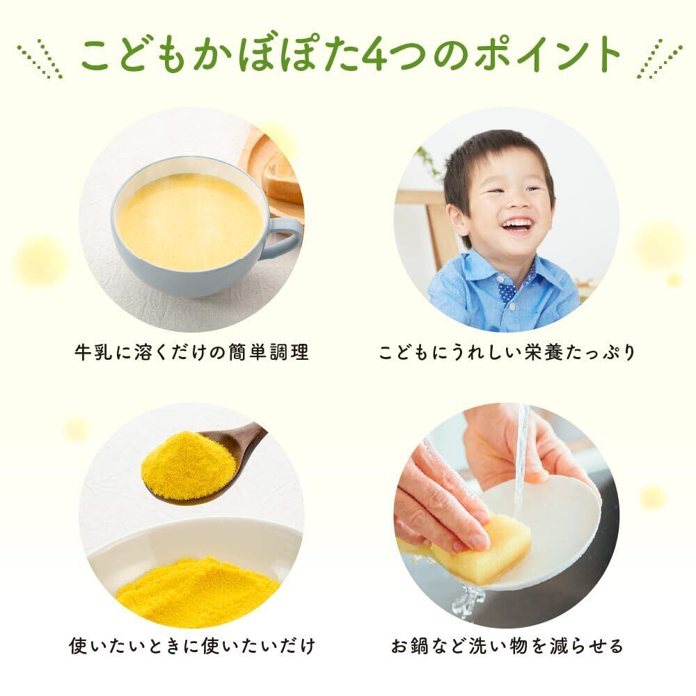 【忙しいパパとママの救世主】 「こどもかぼぽた」は、お子様の成長に欠かせない栄養(鉄分・亜鉛・食物繊維・カリウム・22種の国産野菜)がぎっしり詰まった、牛乳に混ぜるだけの便利なかぼちゃポタージュパウダーです。