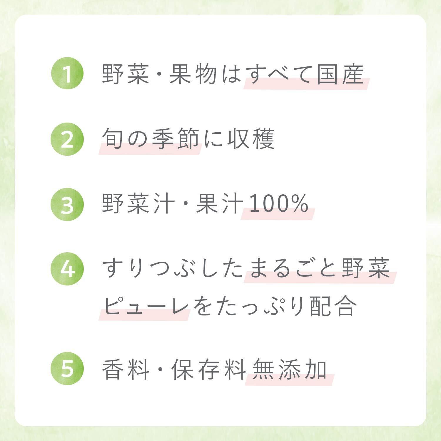 ✨【国産素材100%にこだわりました】素材はすべて国産。旬の季節に収穫するなど、しっかりこだわりました。すりつぶしたまるごと野菜ピューレをたっぷり配合!こだわりのりんご果汁を使い、赤ちゃんにも飲みやすい、まろやかな味わいに仕上げています。生後9か月頃からお飲みいただけます。離乳食や赤ちゃんの栄養補助として。