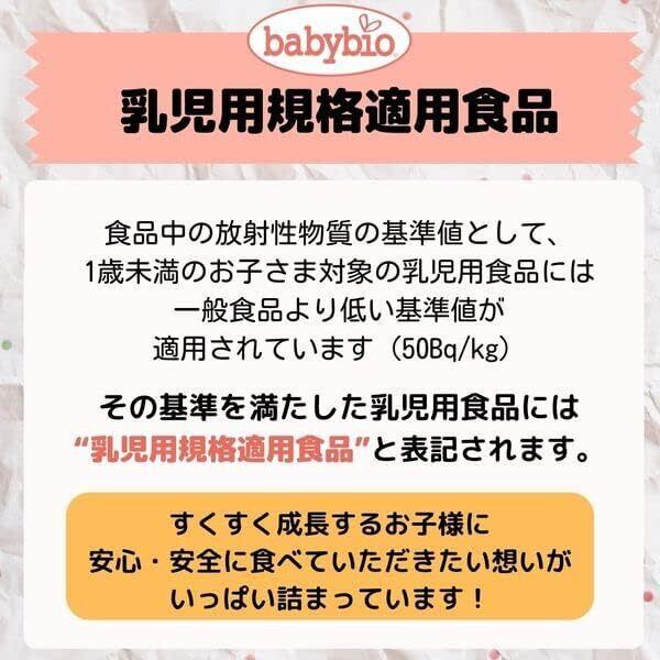 【乳児用規格適用食品】食品中の放射性物質の基準値として、1歳未満のお子さま対象の乳児用食品には 一般食品より低い基準値(50Bq/kg)が適用されているベビーフードです。