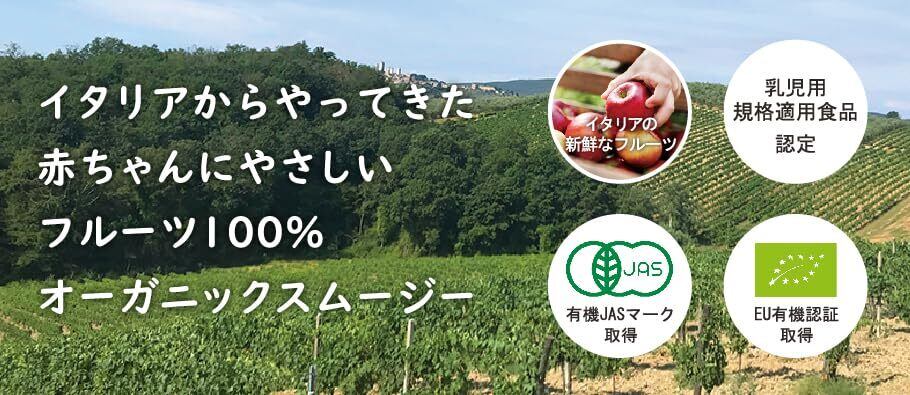 イタリアからやってきた赤ちゃんにやさしいフルーツ100%のオーガニックスムージーです。