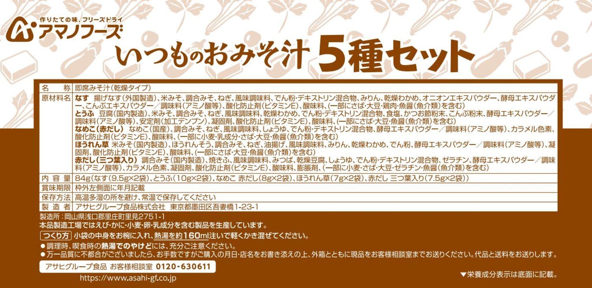 【いつものなす】 揚げなす(外国製造)、米みそ、調合みそ、ねぎ、風味調味料、でん粉・デキストリン混合物、みりん、乾燥わかめ、オニオンエキスパウダー、酵母エキスパウダー、こんぶエキスパウダー/調味料(アミノ酸等)、酸化防止剤(ビタミンE)、酸味料、(一部にさば・大豆・鶏肉・魚醤(魚介類)を含む) 【いつものとうふ】 豆腐(国内製造)、米みそ、調合みそ、ねぎ、風味調味料、乾燥わかめ、でん粉・デキストリン混合物、食塩、かつお節粉末、こんぶ粉末、酵母エキスパウダー/調味料(アミノ酸等)、安定剤(加工デンプン)、凝固剤、酸化防止剤(ビタミンE)、酸味料、(一部にさば・大豆・魚醤(魚介類)を含む) 【いつものなめこ】 なめこ(国産)、調合みそ、ねぎ、風味調味料、しょうゆ、でん粉・デキストリン混合物、酵母エキスパウダー/調味料(アミノ酸等)、カラメル色素、酸化防止剤(ビタミンE)、酸味料、(一部に小麦・乳成分・さば・大豆・魚醤(魚介類)を含む)【いつものほうれん草】米みそ(国内製造)、ほうれんそう、調合みそ、ねぎ、油揚げ、風味調味料、みりん、乾燥わかめ、でん粉、酵母エキスパウダー/調味料(アミノ酸等)、凝固剤、酸化防止剤(ビタミンE)、酸味料、(一部にさば・大豆・魚醤(魚介類)を含む)【いつもの赤だし】調合みそ(国内製造)、焼きふ、風味調味料、みつば、乾燥豆腐、しょうゆ、でん粉・デキストリン混合物、ゼラチン、酵母エキスパウダー/調味料(アミノ酸等)、カラメル色素、凝固剤、酸化防止剤(ビタミンE)、酸味料、膨脹剤、(一部に小麦・さば・大豆・ゼラチン・魚醤(魚介類)を含む)