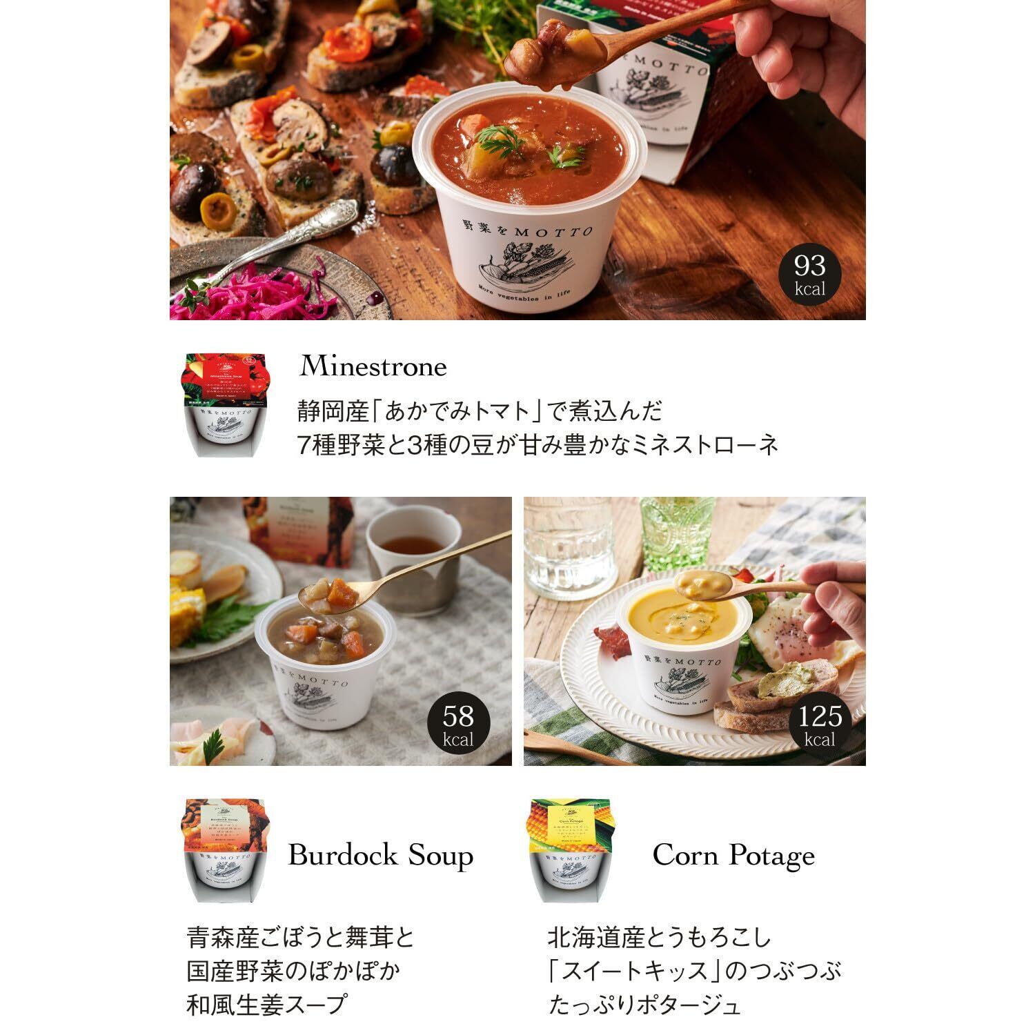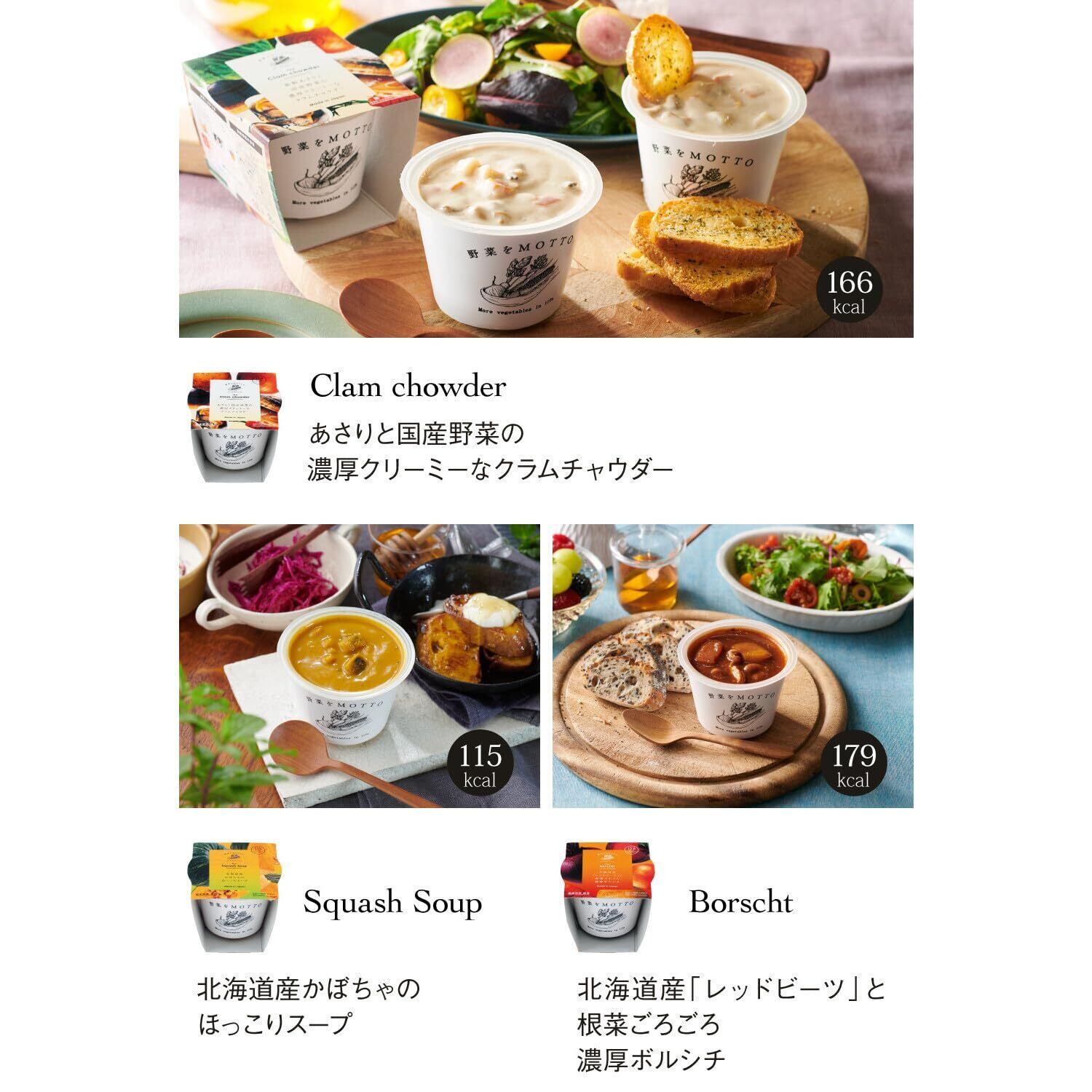 【罪悪感ゼロ!食べ比べスープ6個セット】カロリー200kcal以下のスープですが、ゴロゴロ野菜で腹持ちがよくダイエット中や夜食などにもちょうどいい!また、野菜をMOTTOシリーズで人気フレーバーを食べ比べできるセットなので、飽きずにお召し上がり頂けます。