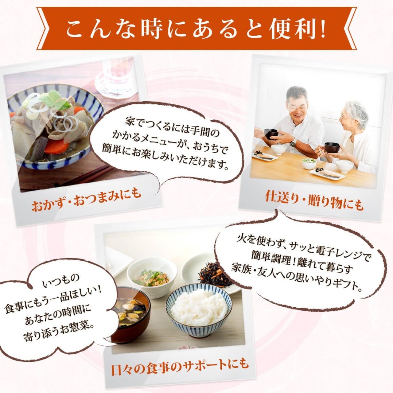 離れて暮らす 両親 高齢者 お年寄り 兄弟 親戚 や 一人暮らし の 息子 娘 単身赴任 の お父さん など 家族 への 仕送り におすすめの 美味しい 食品セット です。 自宅療養 中の方への 仕送りセット にも。