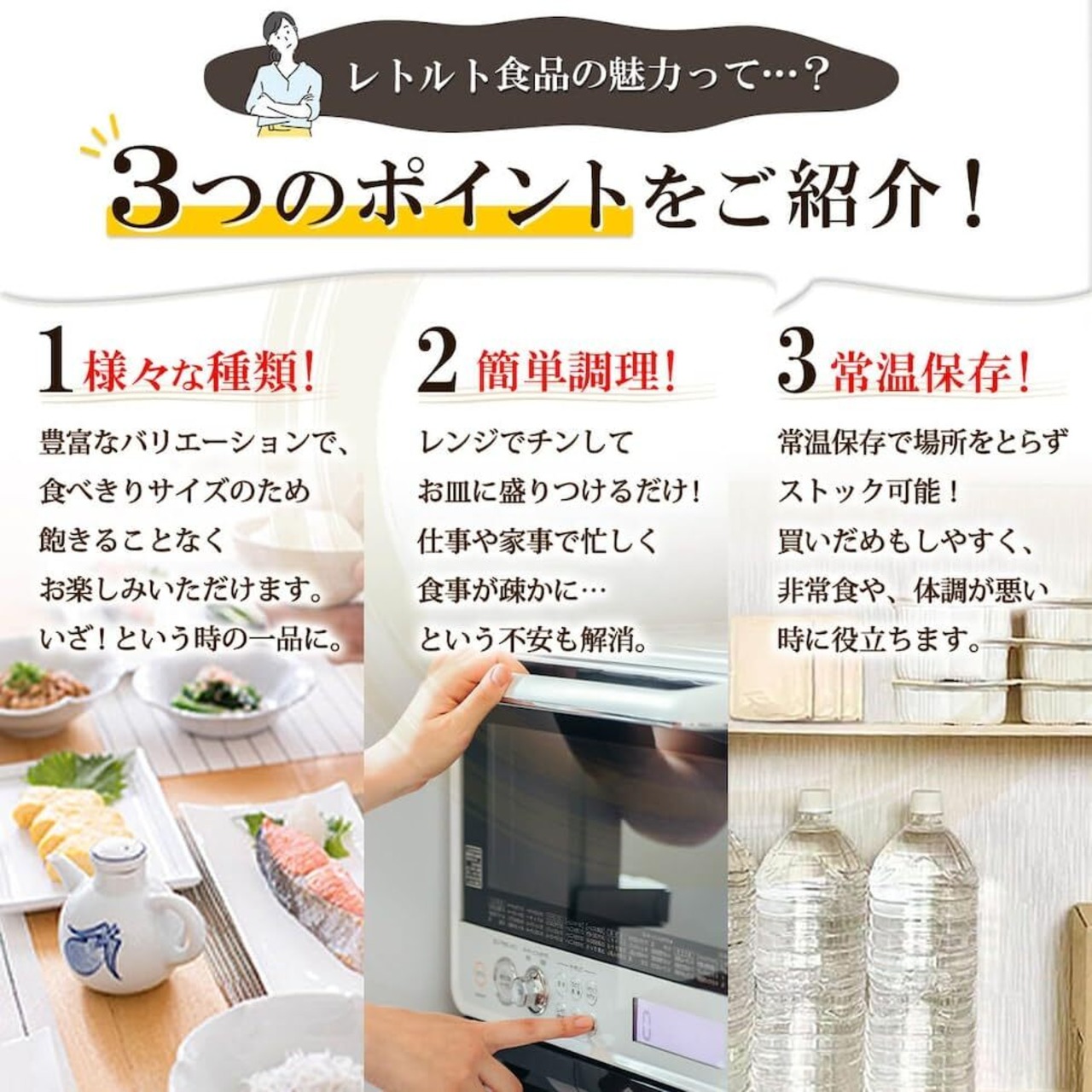 常温保存 が出来て すぐ食べれる食品 を詰め合わせた 食料品セット なので、 普段の 食事 や ローリングストック 常備食 に 防災食品 非常食 保存食 備蓄 食料 や アウトドア 登山 キャンプ 旅行 出張 にも便利。