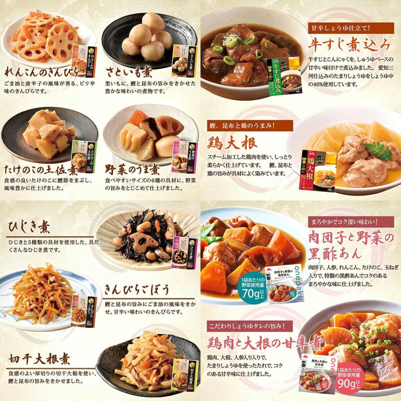 袋を開けるだけ、そのまま食べられて調理要らず 野菜 根菜 の 和風 煮物 おばんざい おふくろの味 シリーズ レンジアップ で温め可能な いつでも手軽に 野菜 をしっかりと摂れる onepaku ( ワンパク )シリーズ