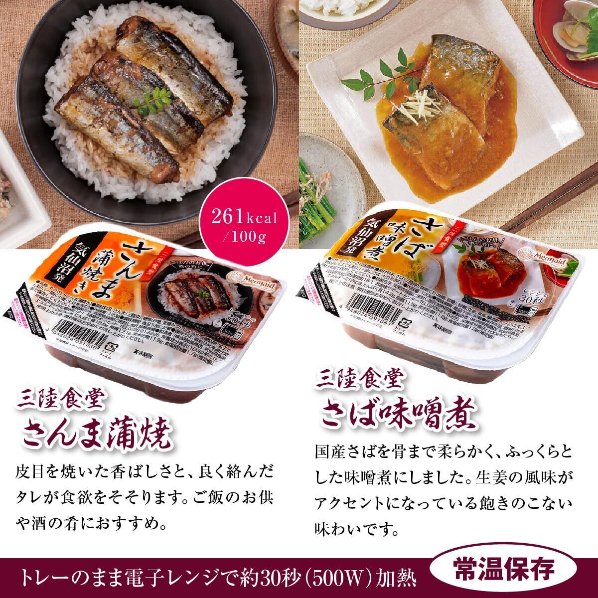 商品内容:三陸食堂(煮魚)さんま蒲焼き/いわし蒲焼き/さば味噌煮/かつおとたけのこの柔らか煮/いわしとごぼうの生姜煮/ぶりと大根の炊き合わせ/真鱈子と野菜の旨煮/さんまと茎わかめの佃煮/渡港町のととバーグ ×2種(デミグラスソースとてりやきソース)の以上10種セットになります。