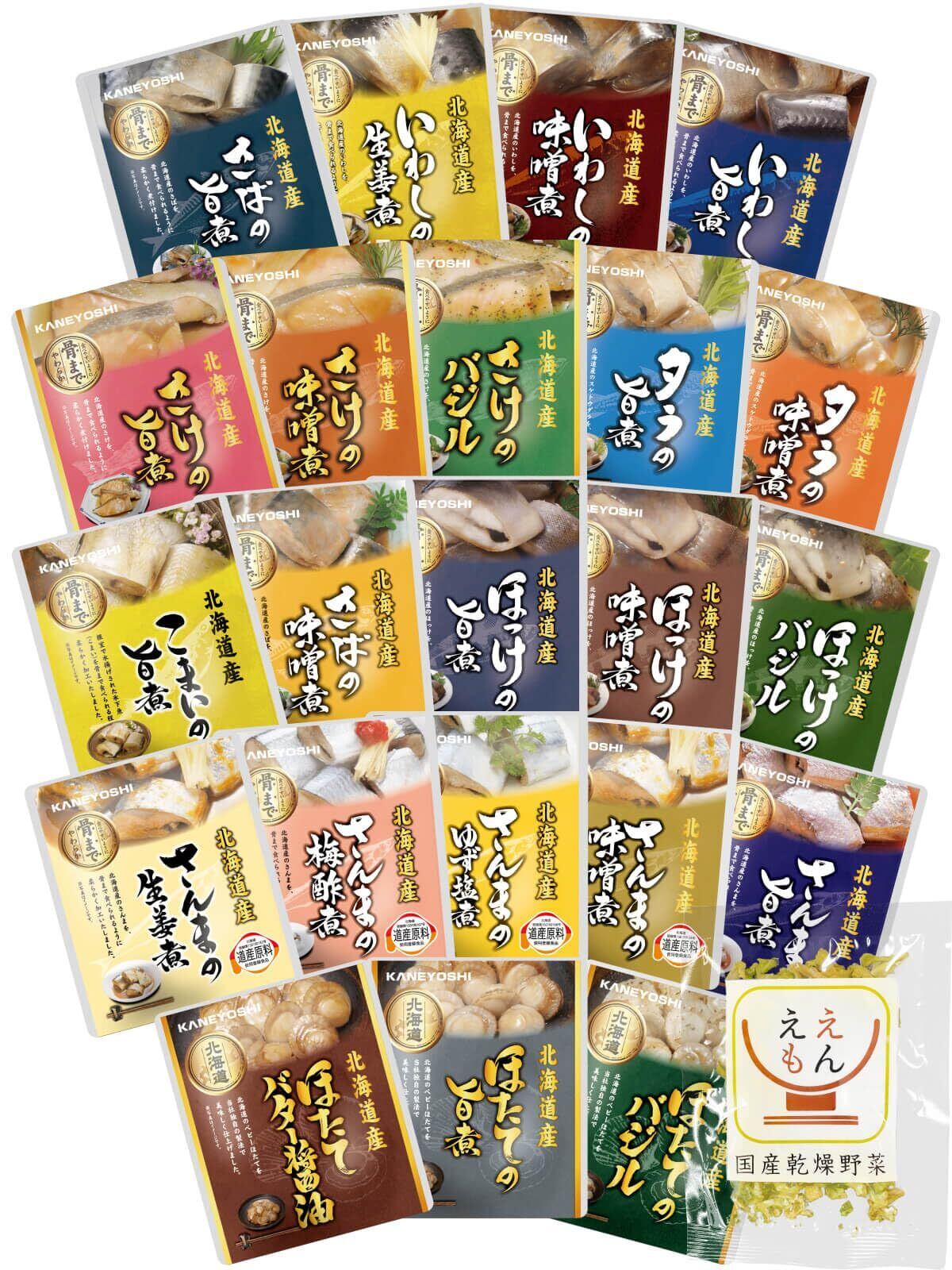 北海道産 の新鮮な 魚介 イワシ サバ サケ サンマ コマイ ホッケ タラ ホタテ を 骨まで食べられる ほど柔らかく煮込んだ 兼由 魚のおかず 詰め合わせ セット ええもん広場 オリジナル 国産 乾燥野菜 付き