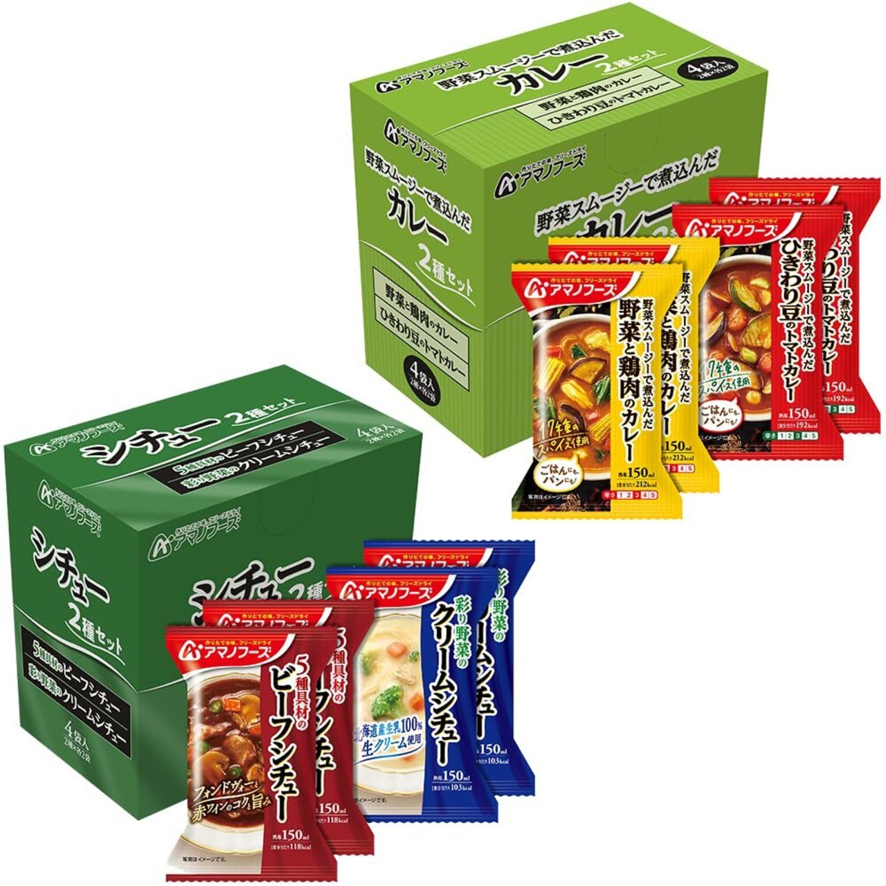 アマノフーズ「カレー2種セット4食」と「シチュー2種セット4食」のセット品