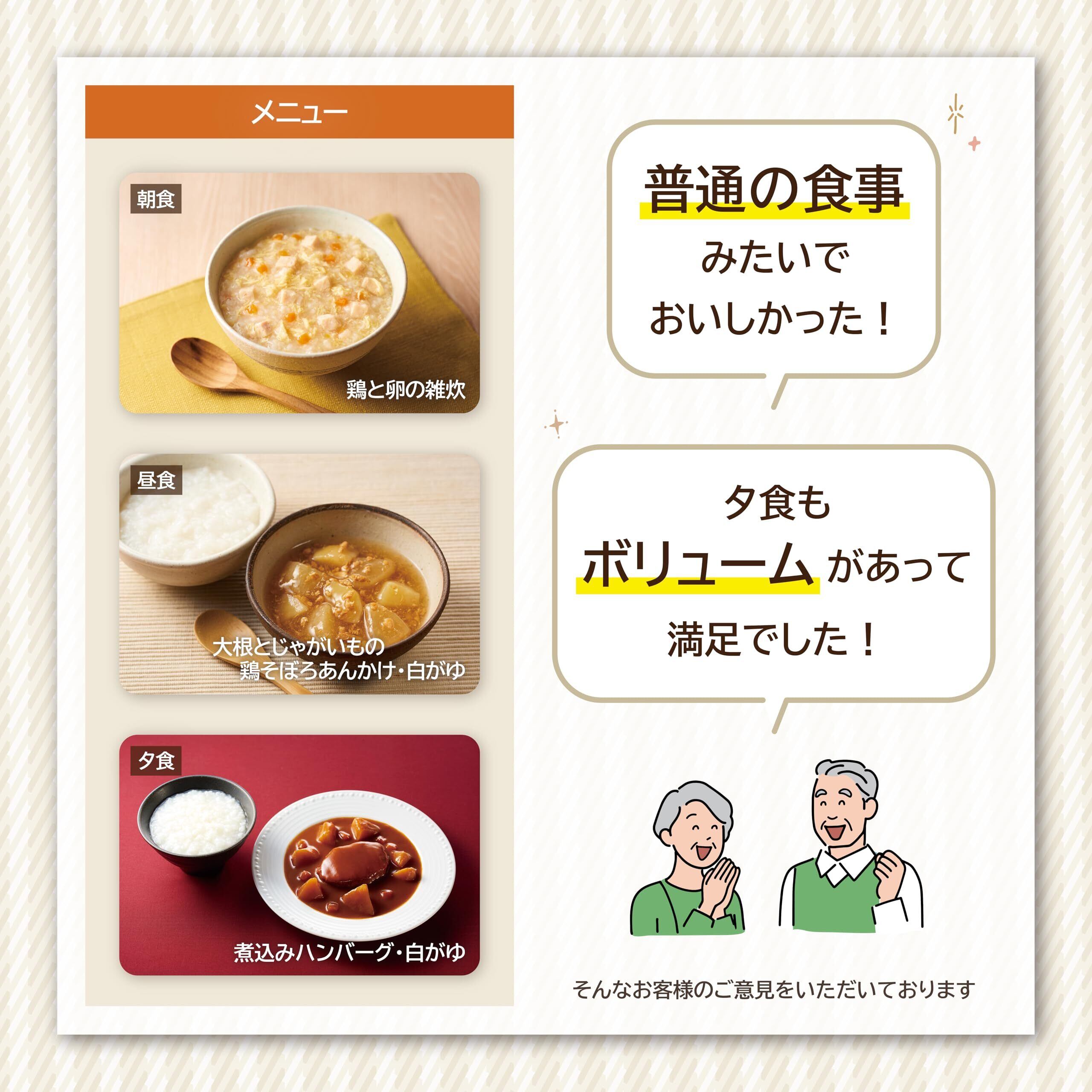 食事内容: 朝食は鶏と卵の雑炊、昼食は大根とじゃがいもの鶏そぼろあんかけと白がゆ、夕食は煮込みハンバーグと白がゆを提供