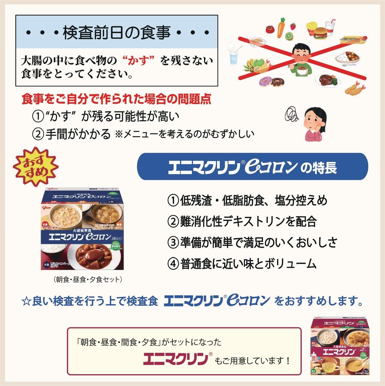 検査食セット: 大腸検査の前日用に設計された3食の特別食事セットです