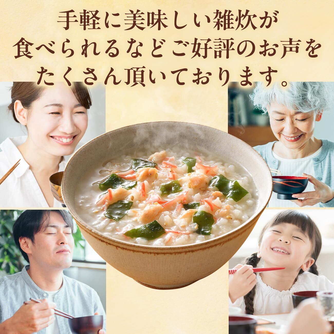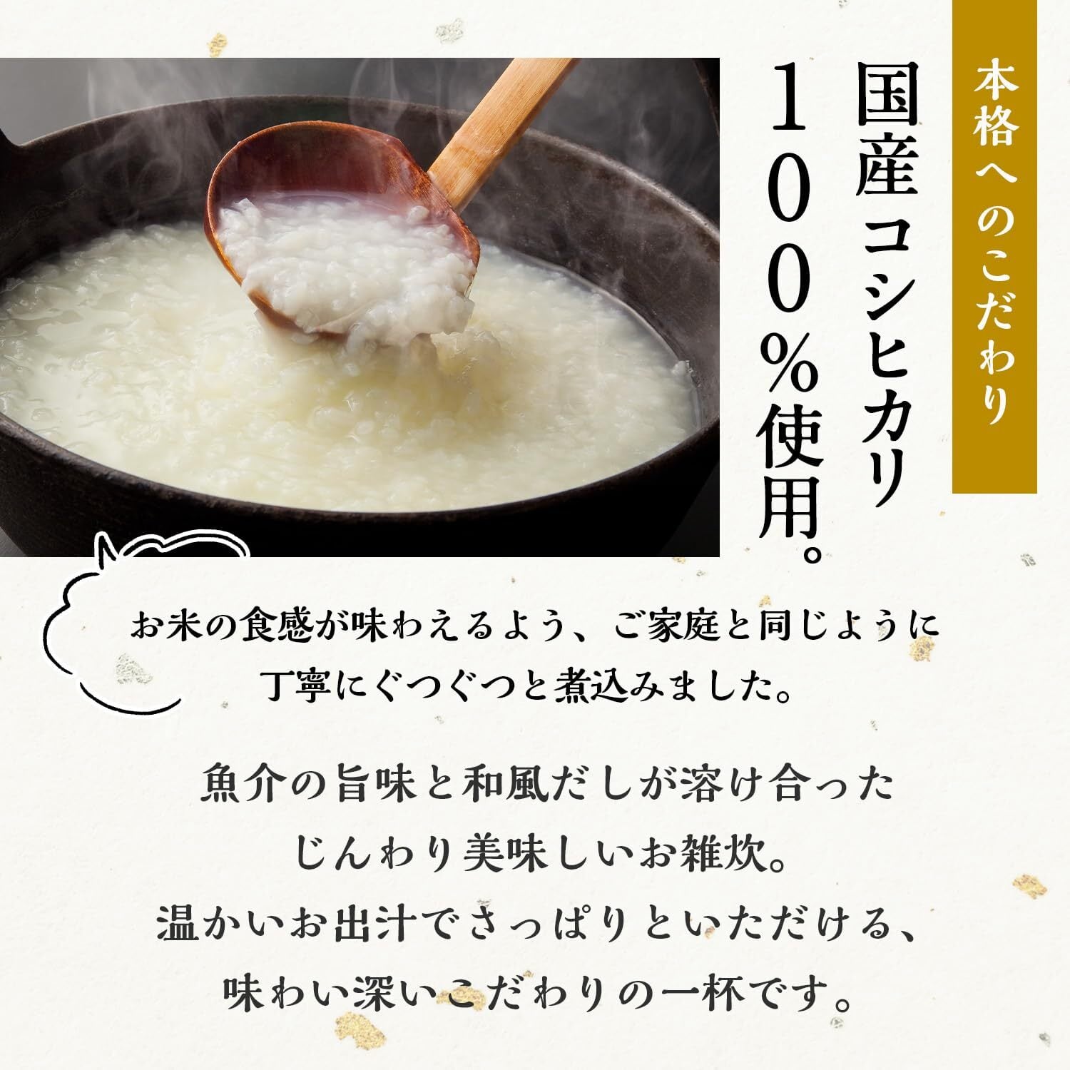 国産コシヒカリを使用し、味わい深いスープで炊き上げた雑炊。海鮮だしとホタテの旨みを閉じ込めた「鮭とわかめの海鮮雑炊」、やさしい和風だしの「国産鶏の和風雑炊」、ごま油香る風味豊かな「海老とチンゲン菜の中華風雑炊」の3種セットです。