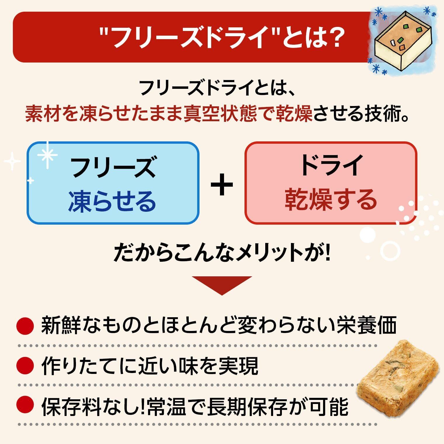 【防災用のローリングストック・体調不良時にも】常温で長期保存が可能なフリーズドライはいざという時のストックに最適。さらにお湯を注いで10秒でできあがるので、体調不良のときでも簡単に食べることができます。