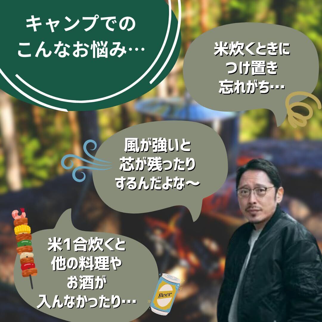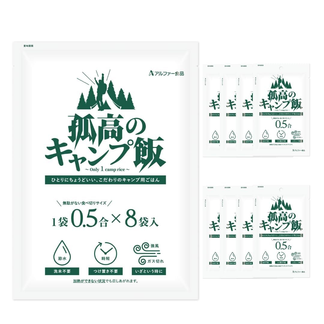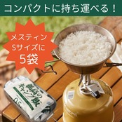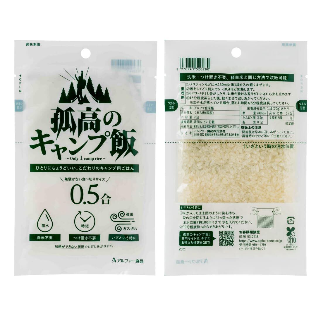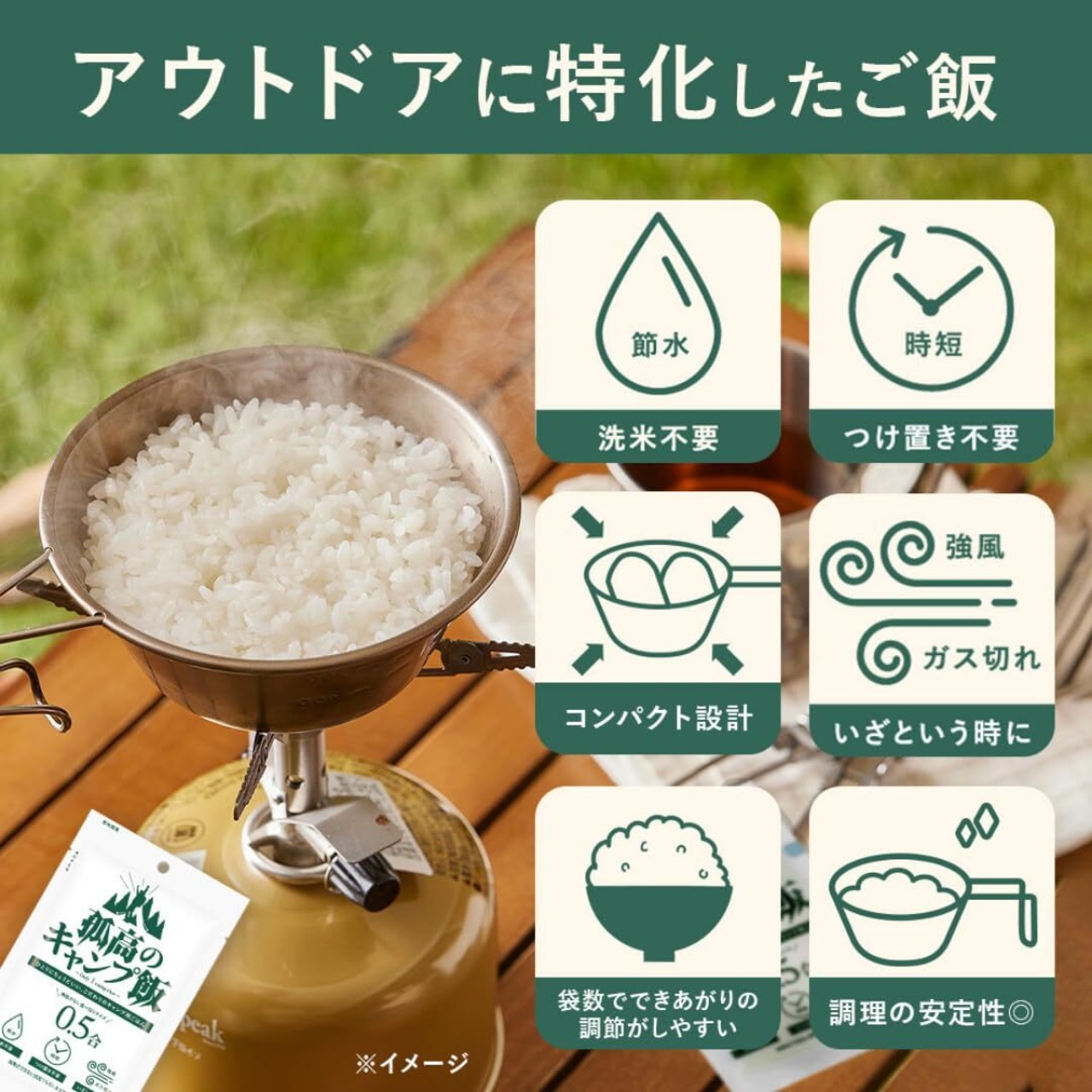 独自製法により、洗米・つけ置き不要で、通常のお米と同じように炊飯できます。キャンプ場についてすぐの食事や、翌日の朝、登山時などに通常よりも早く召しあがりいただけます。お一人にちょうどいい0.5合分で、メスティンやシェラカップでロス無く調理可能です。