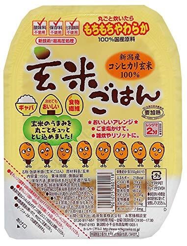 玄米は新潟県産コシヒカリを100%使用しています。超高圧処理により、もちもちやわらかな食感に仕上げました。白米に比べ、食物繊維・カルシウム・ギャバを豊富に含み、栄養価が高く、レンジでチン! するだけで手軽に摂取でき便利です。