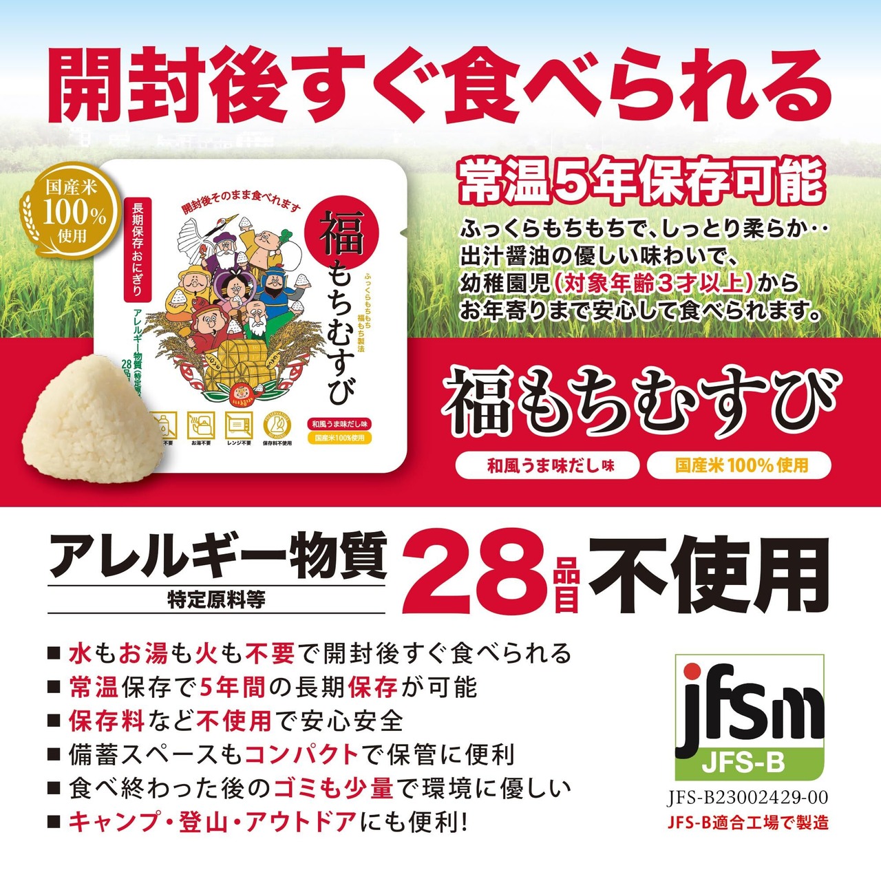 長期保存おにぎり「福もちむすび」とは ・国産米100%使用 お米作りから取り組んでいます。 ・新開発!アレルギー物質(特定原材料等)28品目不使用 ・常温保存で5年間の賞味期限を実現、長期保存が可能 ・水もお湯も火も不要で、袋から出してそのまま食べることができる。 ・備蓄スペースもコンパクトで保管に便利。 ・食べ終わったら後のゴミも少量で環境にやさしい。 ・しっとり柔らかで、幼稚園児(対象年齢3才以上)からお年寄りまで美味しく召し上がれます。 ・JFS-B適合の食品工場にて製造。 ・災害初期のインフラ崩壊時に威力を発揮します。