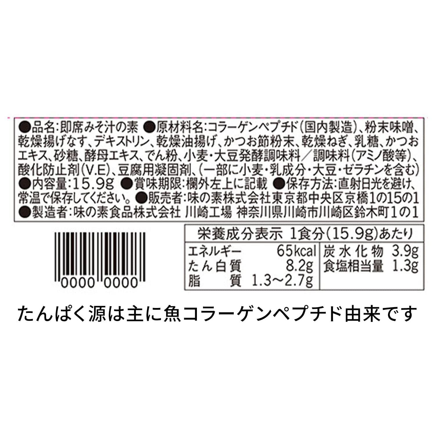 コラーゲンペプチド(国内製造)、粉末味噌、乾燥揚げなす、デキストリン、乾燥油揚げ、かつお節粉末、乾燥ねぎ、乳糖、かつおエキス、砂糖、酵母エキス、でん粉、小麦・大豆発酵調味料/調味料(アミノ酸等)、酸化防止剤(V.E)、豆腐用凝固剤、(一部に小麦・乳成分・大豆・ゼラチンを含む)