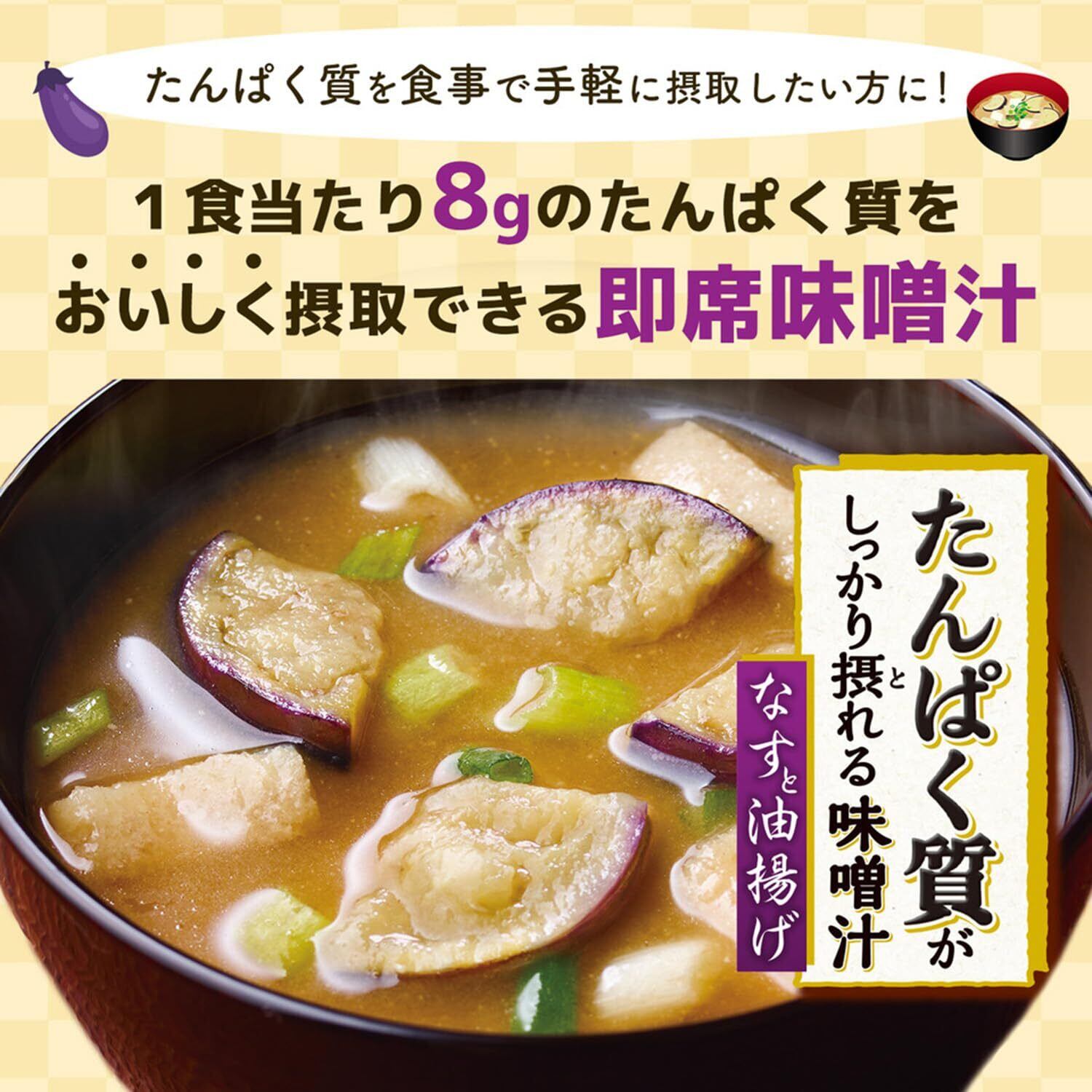 一食当たり8gのたんぱく質が摂取できる即席味噌汁です。