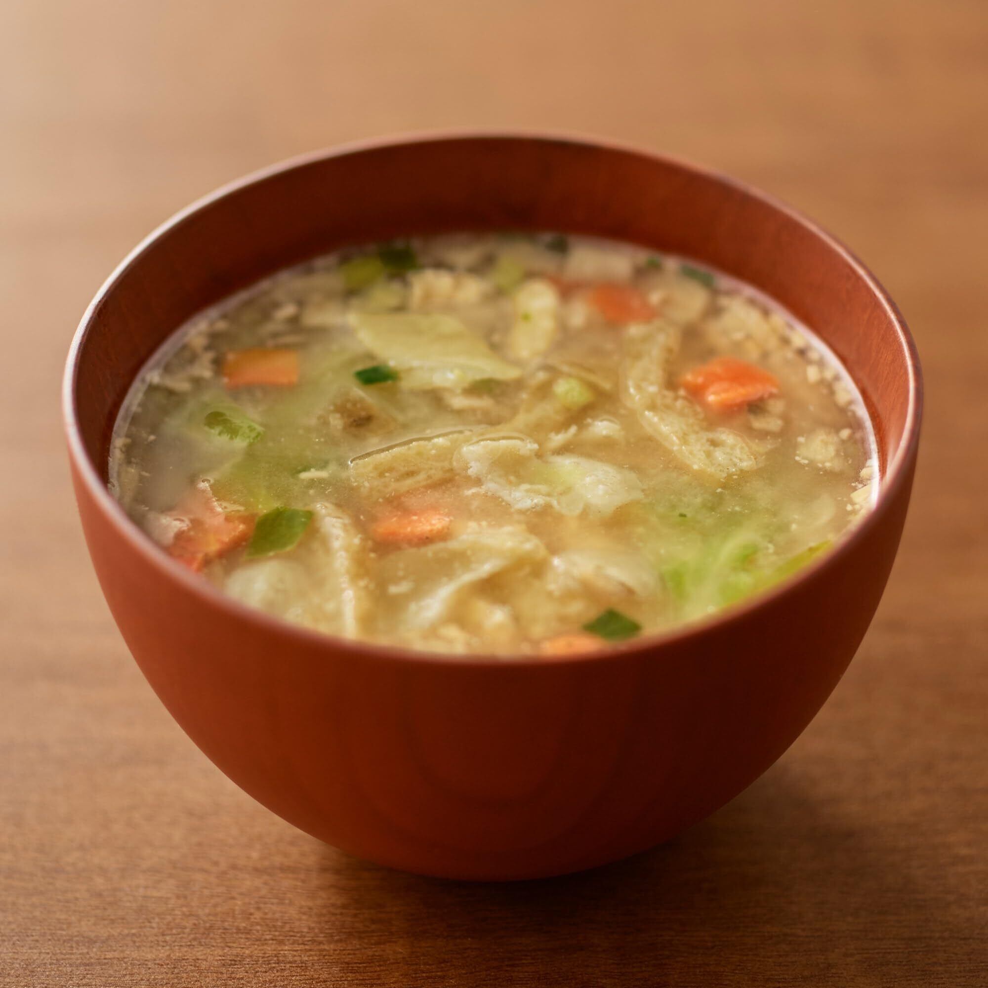 豚肉やキャベツ、ごぼう、油揚げなどをいれて仕上げました。豚肉と野菜の旨みを生かした甘めの味噌仕立てです。