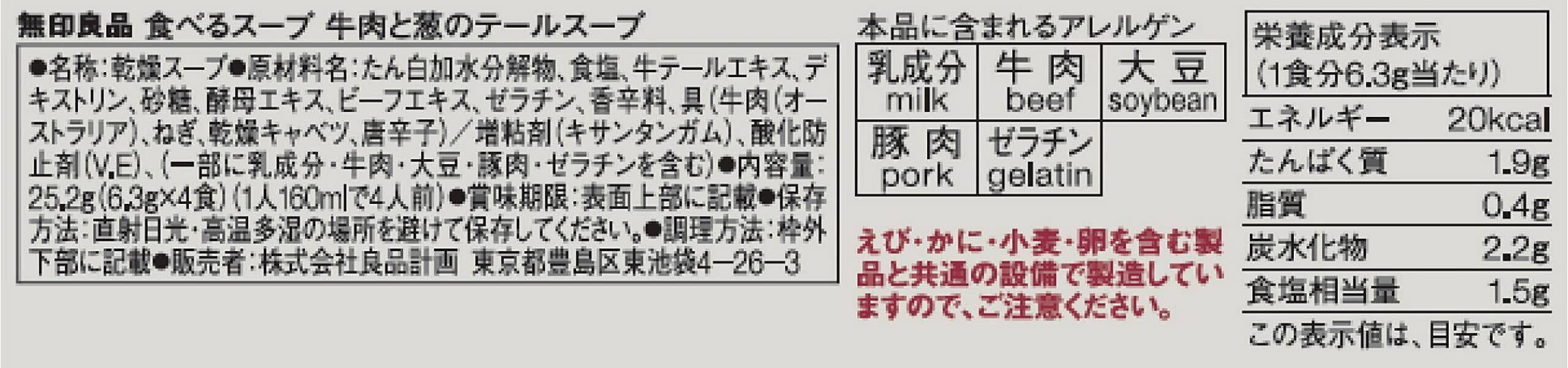 原材料名 : たん白加水分解物、食塩、牛テールエキス、デキストリン、砂糖、酵母エキス、ビーフエキス、ゼラチン、香辛料、具 (牛肉 (オーストラリア) 、ねぎ、乾燥キャベツ、唐辛子、増粘剤 (キサンタンガム) 、酸化防止剤 (V.E) (一部に乳成分、牛肉、大豆、豚肉、ゼラチンを含む)