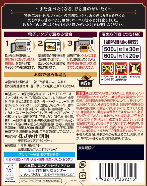 原材料:牛肉(オーストラリア)、ソテーオニオン(たまねぎ、りんご、香味油、にんにく)、たまねぎ、小麦粉、牛脂、炒めたまねぎ、砂糖、トマトペースト、カレー粉、濃縮ブイヨン、トマトケチャップ、食塩、りんごペースト、香辛料、ビーフエキス調味料、ベース調味料、植物油脂、バター、カカオマス、ガーリックペースト、クリーミングパウダー、ブイヨンオイル/調味料(アミノ酸等)、カラメル色素、乳化剤、香料、(一部に小麦・乳成分・牛肉・大豆・鶏肉・豚肉・りんご・ゼラチンを含む)