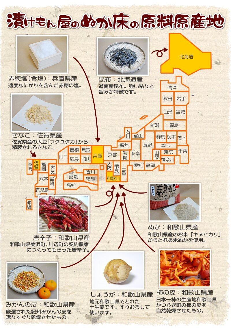 【無添加!自然材料をそのままに】原料の糠は和歌山県産のお米キヌヒカリからとれる糠だけを使います。そして調味料は兵庫県赤穂の塩、北海道の道南産昆布、 和歌山県干し柿の里の柿の皮、和歌山県美浜の唐辛子、和歌山県紀州みかんの皮、そして佐賀県産のきな粉です。 100%国産の原料です。それら自然の材料を一切の加工もなくそのまま使いますので完全に無添加のぬか床ができます。