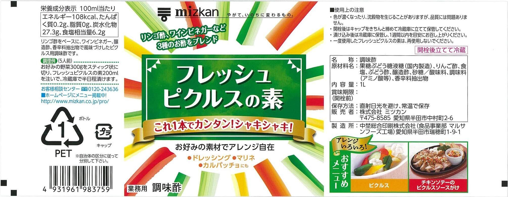リンゴ酢(りんご酢)をベースに、ワインビネガー、醸造酢、香辛料抽出物で風味づけしたピクルス用調味酢です。1時間から半日程度漬け込むだけで、シャキシャキした野菜の食感も楽しめる、ほどよい酸味と甘みが特徴のピクルスが、調理経験の乏しい方でも、簡単に、作ることが出来ます。香辛料などの素材を加えるだけで、お客様のニーズにマッチした、お店独自のメニュー作りにも役立ちます。スパイス風味のドレッシング、マリネ、カルパッチョにもお使いいただけます。※本製品は業務用製品ですが、一般消費者の方にもお使い頂けます。 原材料・成分 果糖ぶどう糖液糖(国内製造)、りんご酢、食塩、ぶどう酢、醸造酢、砂糖/酸味料、調味料(アミノ酸等)、香辛料抽出物