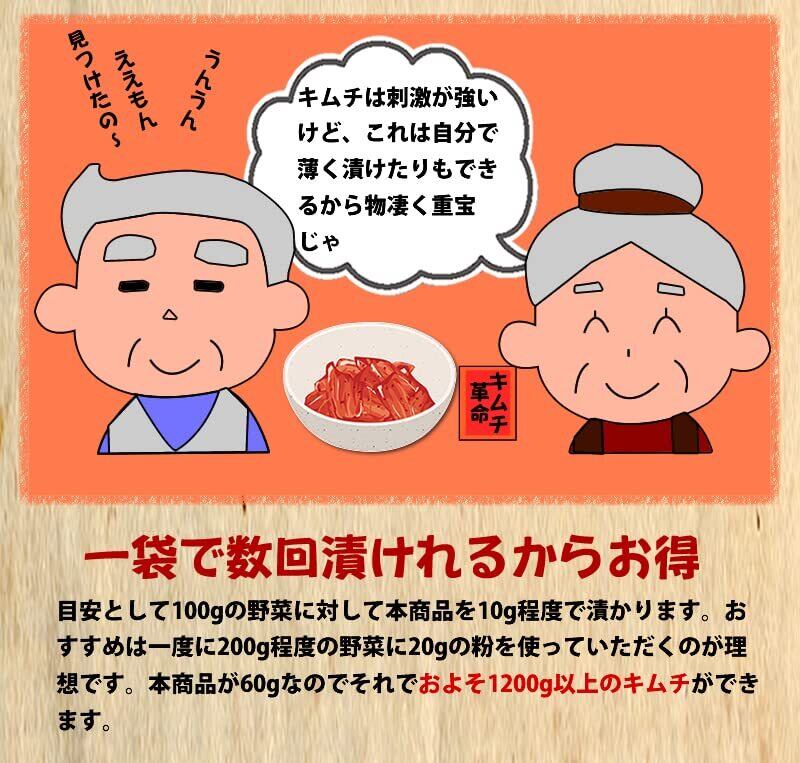 【無添加キムチパウダー60g×1袋】作る分量は、野菜の量に合わせて加減くださいませ。 目安は野菜100gに対し無添加キムチパウダー10gです。 オススメは一度に200gほどの野菜に20gのキムチパウダーでお作りいただくのが理想です。一袋で白菜半玉分のキムチが漬けられます。