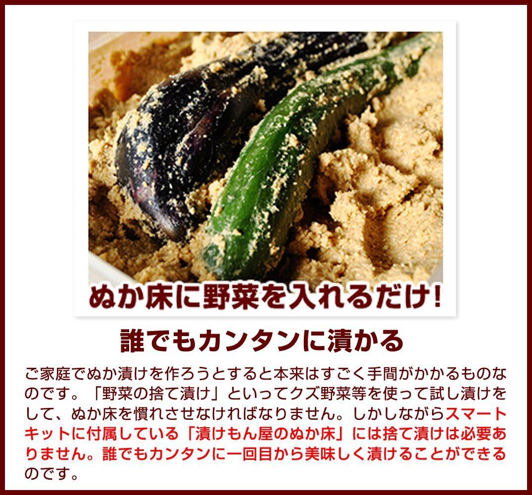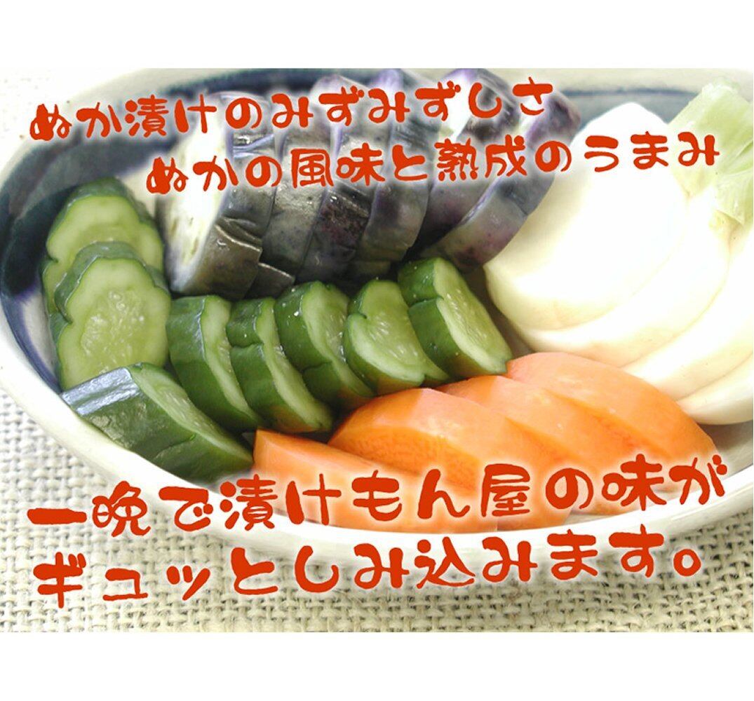 【誰でもカンタンに漬かるぬか床】ご家庭でぬか漬けを作ろうとすると本来はすごく手間がかかるものなのです。「野菜の捨て漬け」といってクズ野菜等を使って試し漬けをして、ぬか床を慣れさせなければなりません。しかしながら「漬けもん屋のぬか床」には捨て漬けは必要ありません。誰でもカンタンに一回目から美味しく漬けることができるのです。