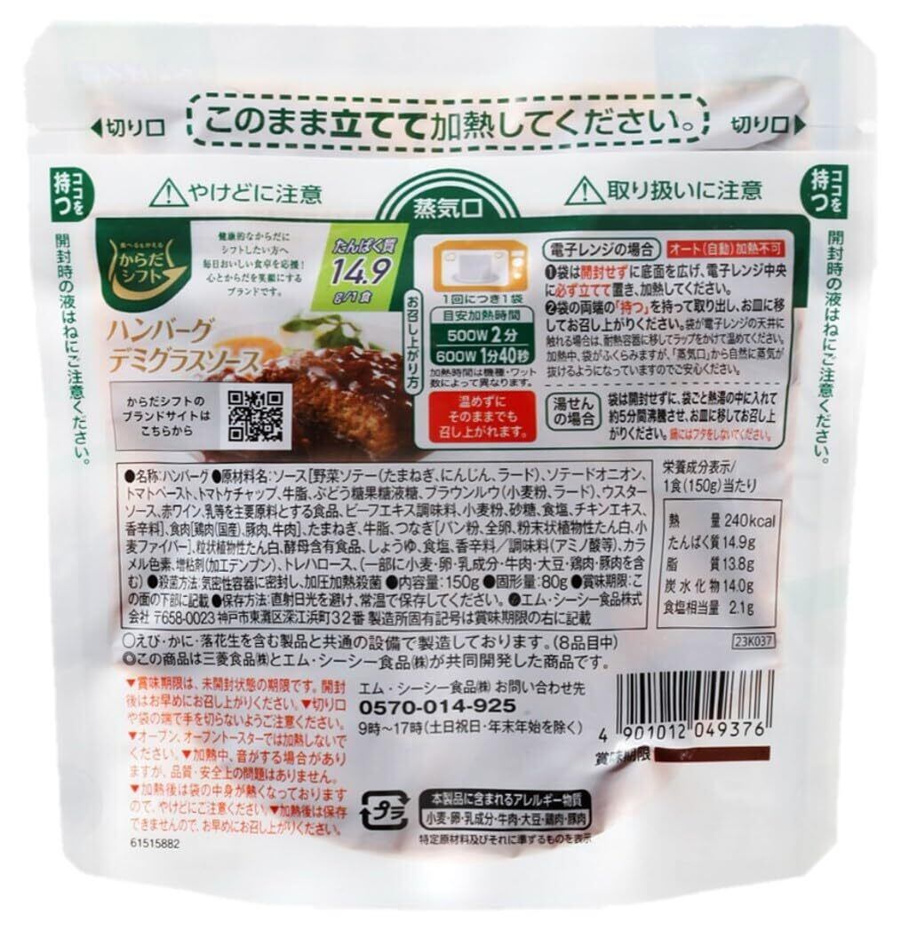 健康的なからだにシフトしたい方へ、毎日おいしい食卓を応援します。たんぱく質をイメージしやすい肉系商品として、食事からたんぱく質をしっかりと摂りたい方に。ふっくらジューシーな食感にこだわったハンバーグに野菜の旨みと甘味が際立つコク深いデミグラスソースをあわせました。一食でたんぱく質14.9gを摂ることができます。 原材料・成分 ソース[野菜ソテー(たまねぎ、にんじん、ラード)、ソテードオニオン、トマトペースト、トマトケチャップ、牛脂、ぶどう糖果糖液糖、ブラウンルウ(小麦粉、ラード)、ウスターソース、赤ワイン、乳等を主要原料とする食品、ビーフエキス調味料、小麦粉、砂糖、食塩、チキンエキス、香辛料]、食肉[鶏肉(国産)、豚肉、牛肉]、たまねぎ、牛脂、つなぎ[パン粉、全卵、粉末状植物性たん白、小麦ファイバー]、粒状植物性たん白、酵母含有食品、しょうゆ、食塩、香辛料/調味料(アミノ酸等)、カラメル色素、増粘剤(加工デンプン)、トレハロース、(一部に小麦・卵・乳成分・牛肉・大豆・鶏肉・豚肉を含む)