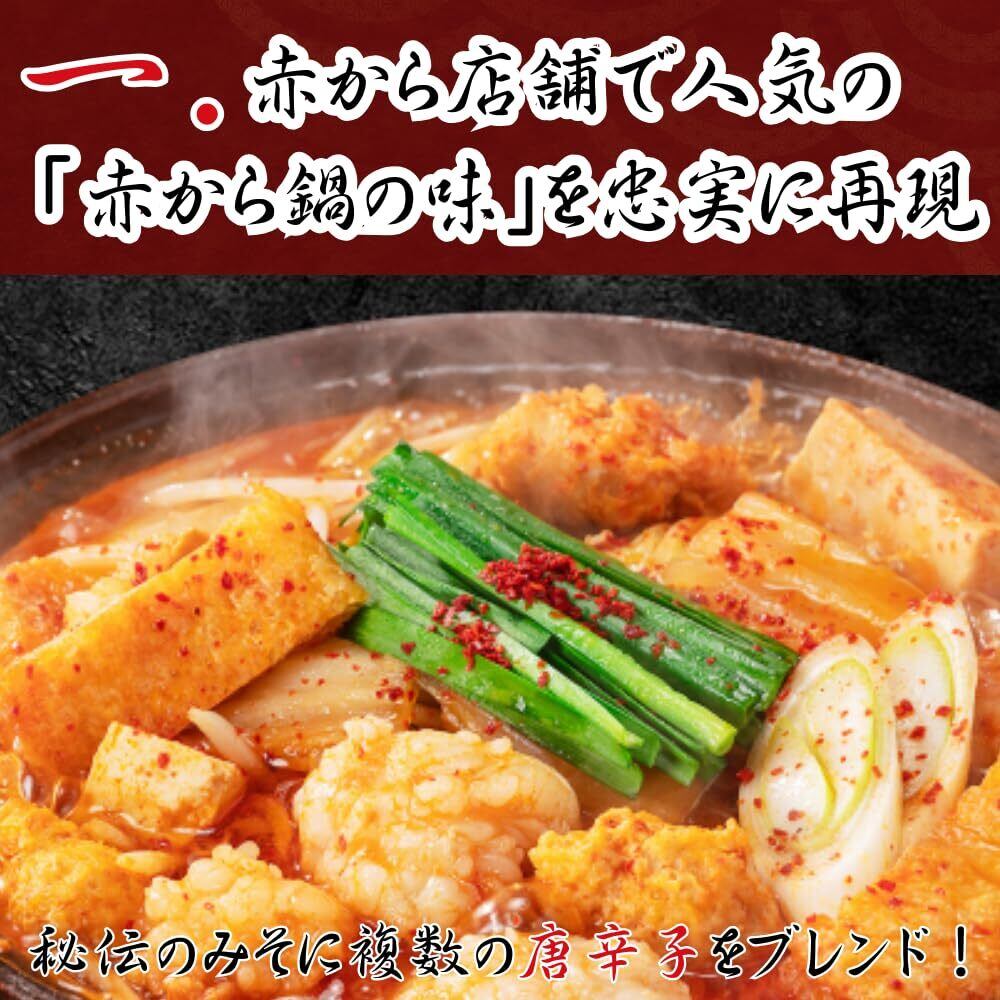 全国で大人気のお店 赤から の味をご家庭でお楽しみいただけます。 名古屋味噌にはちみつ、昆布、鰹節、オイスターソース、にんにくでうまみたっぷりのだしをとり、これに唐辛子、豆板醤、コチュジャンを加えました。 豚バラ肉、白菜、もやし、ニラ、白ネギ、とうふ、油あげ(お勧めです)をたっぷりお召し上がりください。 シメの雑炊が、またうまい!