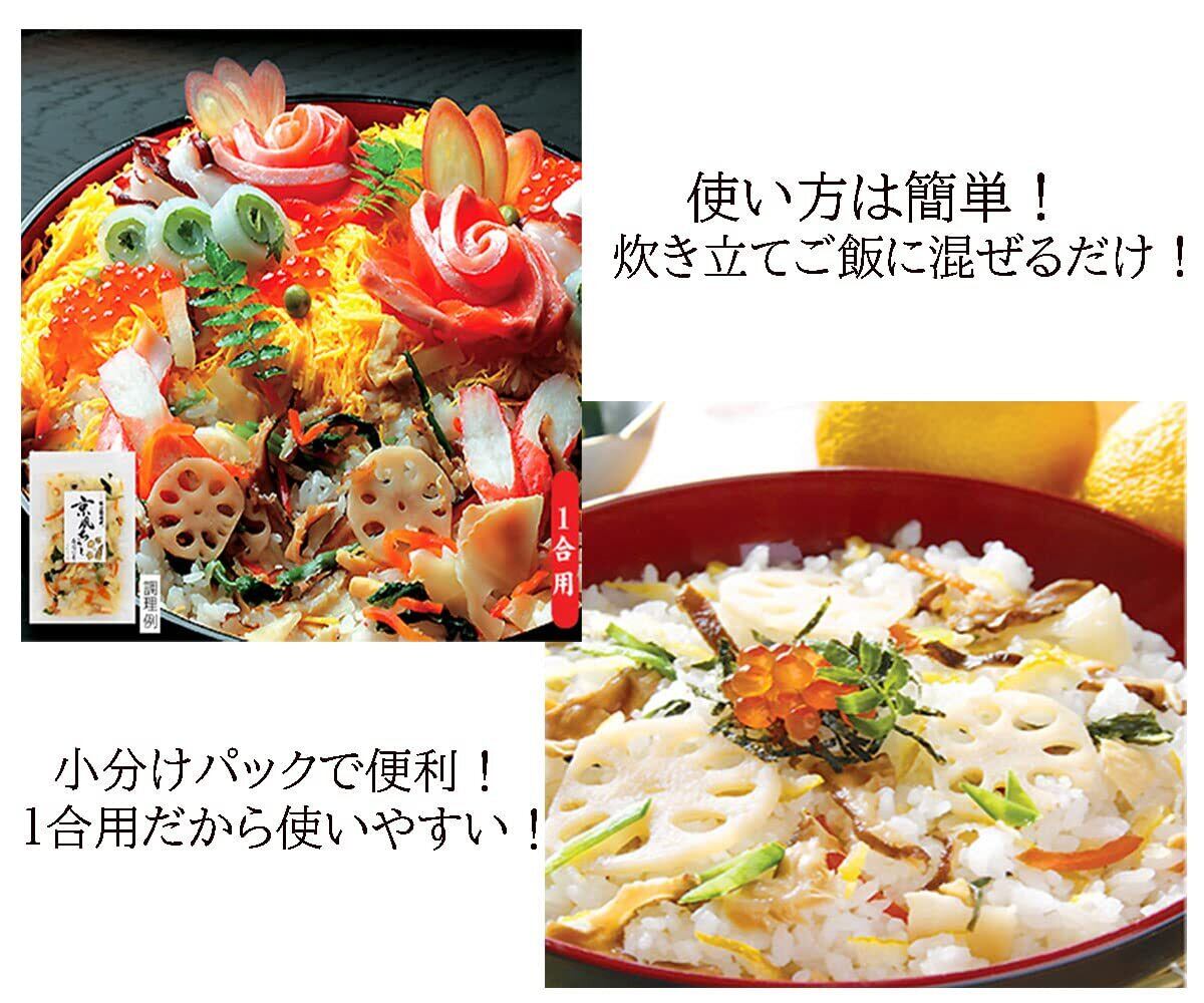 【作り方】 作り方はとっても簡単 炊きたてご飯に混ぜるだけ! 錦糸玉子や刻みのりを加えるだけで、本格的なちらし寿司が出来上がります。 一人暮らしや小人数のご家庭でもお使い頂けるように、1合用となっております。 ひなまつり等のお祝い事はもちろん、行楽のお弁当やいなり寿司など普段使いにもご利用頂けます。 お好みでエビやマグロ等を添えて海鮮丼風にする事も出来ます。 また、鞍馬山椒を乗せてもおいしいです。