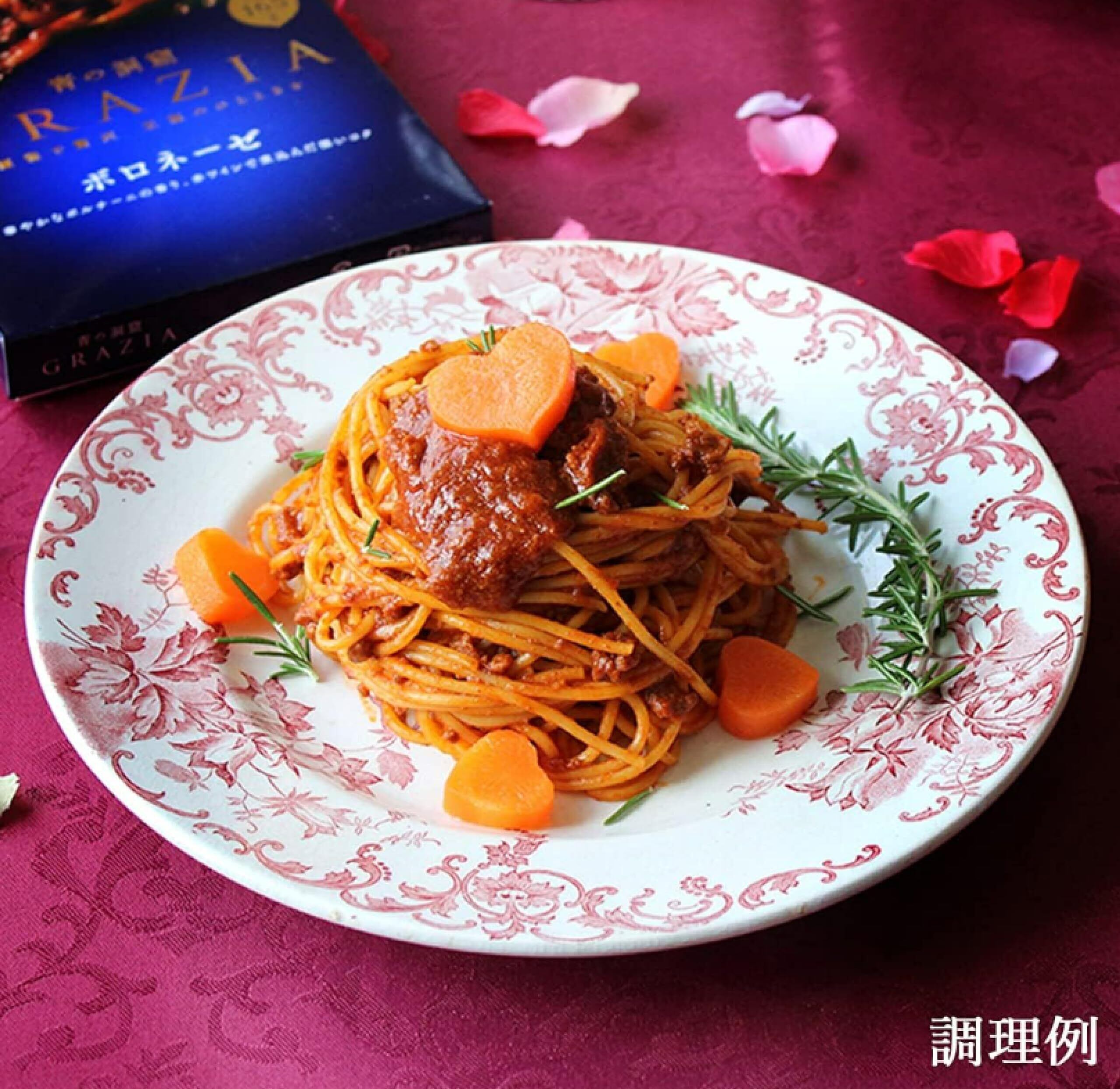 青の洞窟ブランドに新シリーズが登場。その名は「GRAZIA」です。赤ワイン煮込みの挽肉をふんだんに使用。ポルチーニの華やかな香りと共にお楽しみください。お肉の旨みを華やかな香りと共に、贅沢に味わえるボロネーゼ。優雅で贅沢、至福のひとときをお楽しみください。一人前 たっぷりの165gです。
