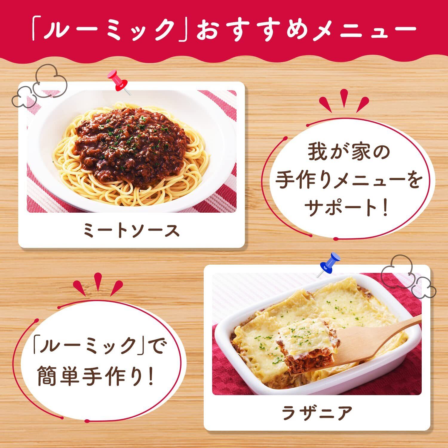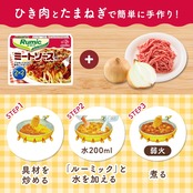ひき肉とたまねぎを炒めて、「ルーミック」ミートソース用と水を加えるだけでトマトのうま味がギュッとつまったコクのある、お子様の大好きなミートソースがお手軽にお楽しみいただけます。家族みんなが大好きな洋風定番メニューがたっぷり作れる粉タイプの洋風手作りソースの素です。