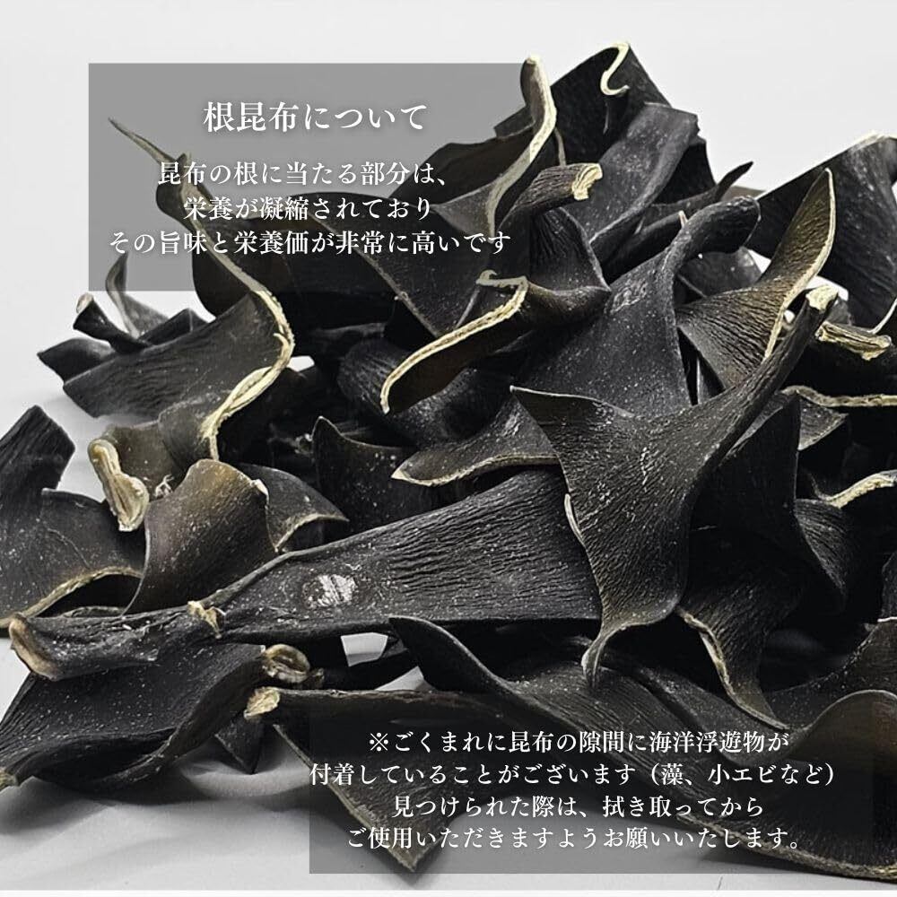 【根昆布とは?】根昆布は、昆布の中でも根の部分だけを切り出したものです。通常の昆布と比較して根昆布は昆布が生長する起点になる部分で、成長する為に必要な栄養分を集中させているので栄養価が高いことが特徴です。
