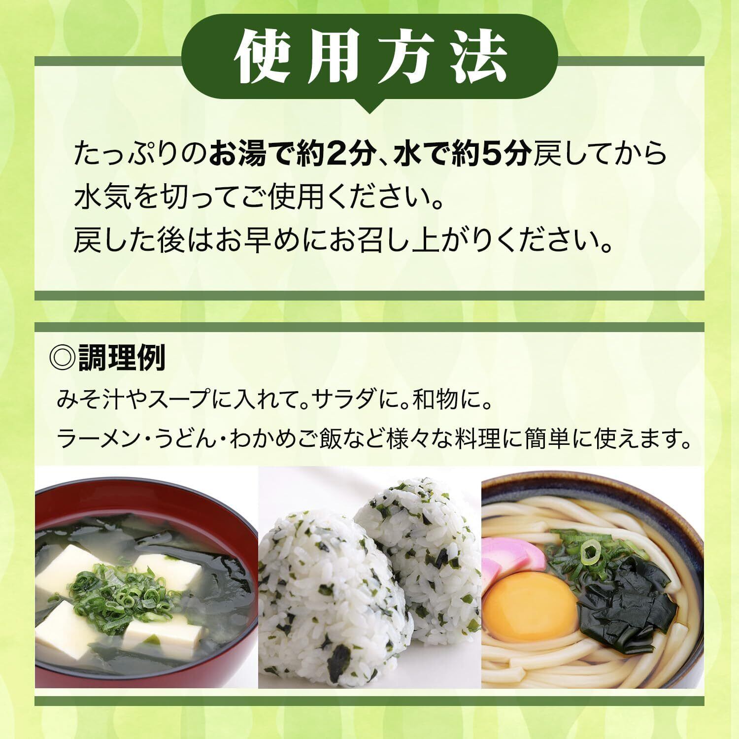 使いやすい乾燥わかめです。チャック袋に入っております。家族皆で楽しめるカットワカメです。たっぷりのお湯で約2分、水で約5分戻してから水気を切ってご使用ください。