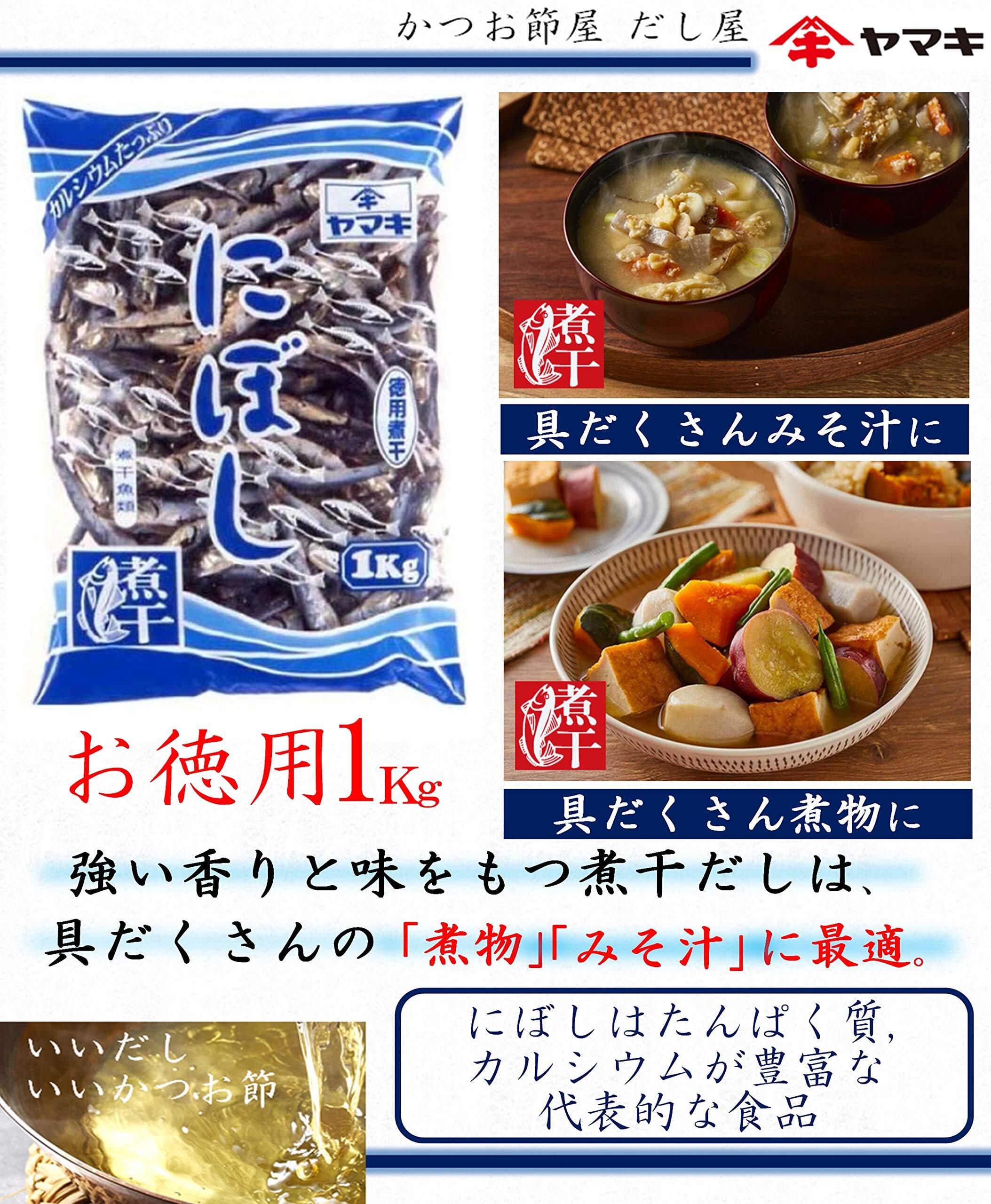 煮干はたんぱく質やカルシウムを豊富に含む代表的な食品です。コクがあり、風味の強いだしをお楽しみ頂けます。 【美味しいだしの取り方】にぼしは水量の約3%(例えば水1Lに対して30g)をおすすめします。頭とはらわたを取り除くと、より一層おいしいだしがとれます。 是非一度お試しください。