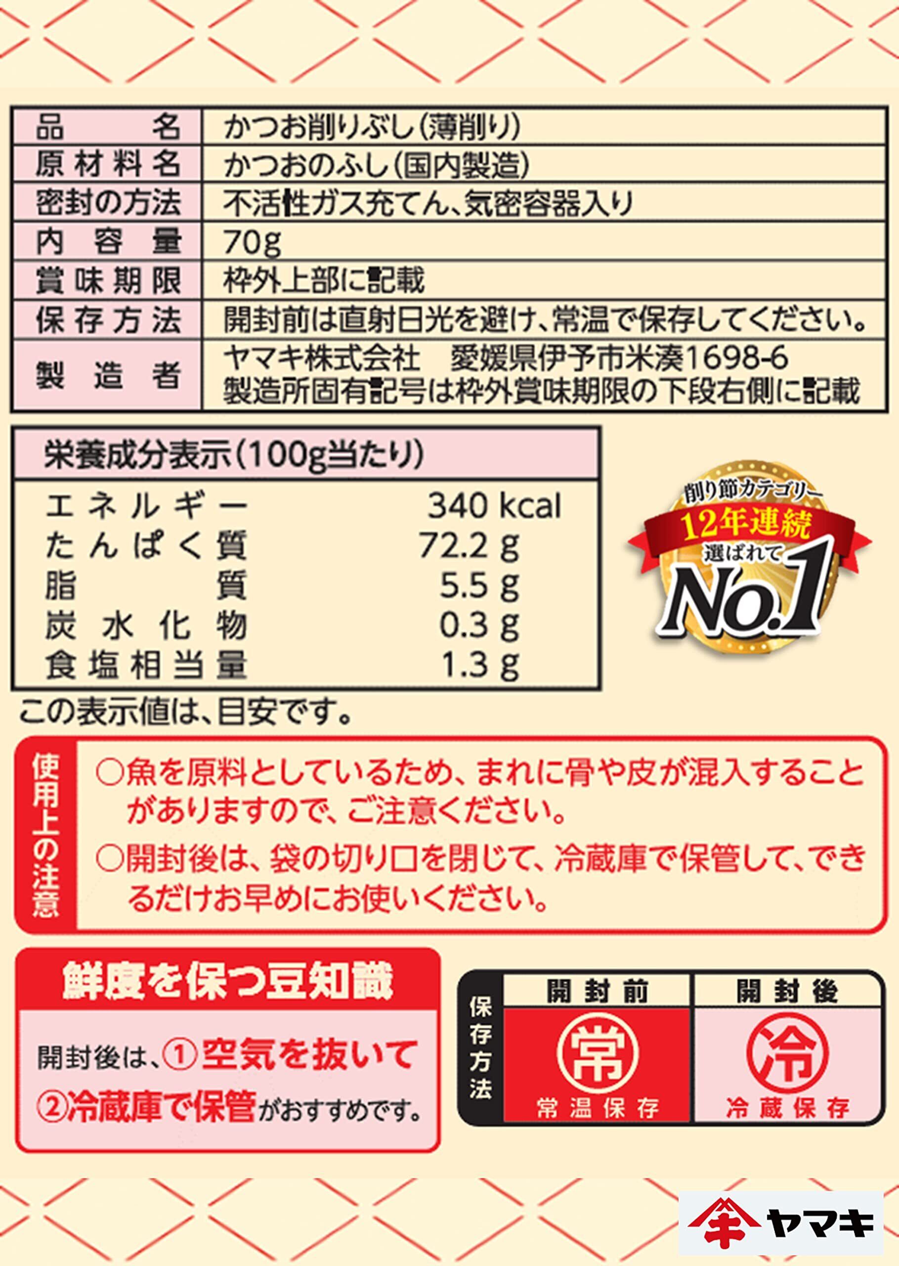国内で造ったかつお節を薄く削り、豊かな香りを逃がさず密封しました。だし取りやトッピングでご使用いただけます。