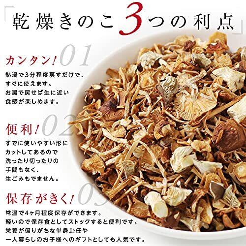 【湯戻しだけで料理に使える!】湯戻しするだけ、汁物にそのまま入れるだけでたっぷりきのこがとれて、忙しい主婦の味方です。安心安全な国産きのこの美味しさと、栄養をギュッと凝縮しました。