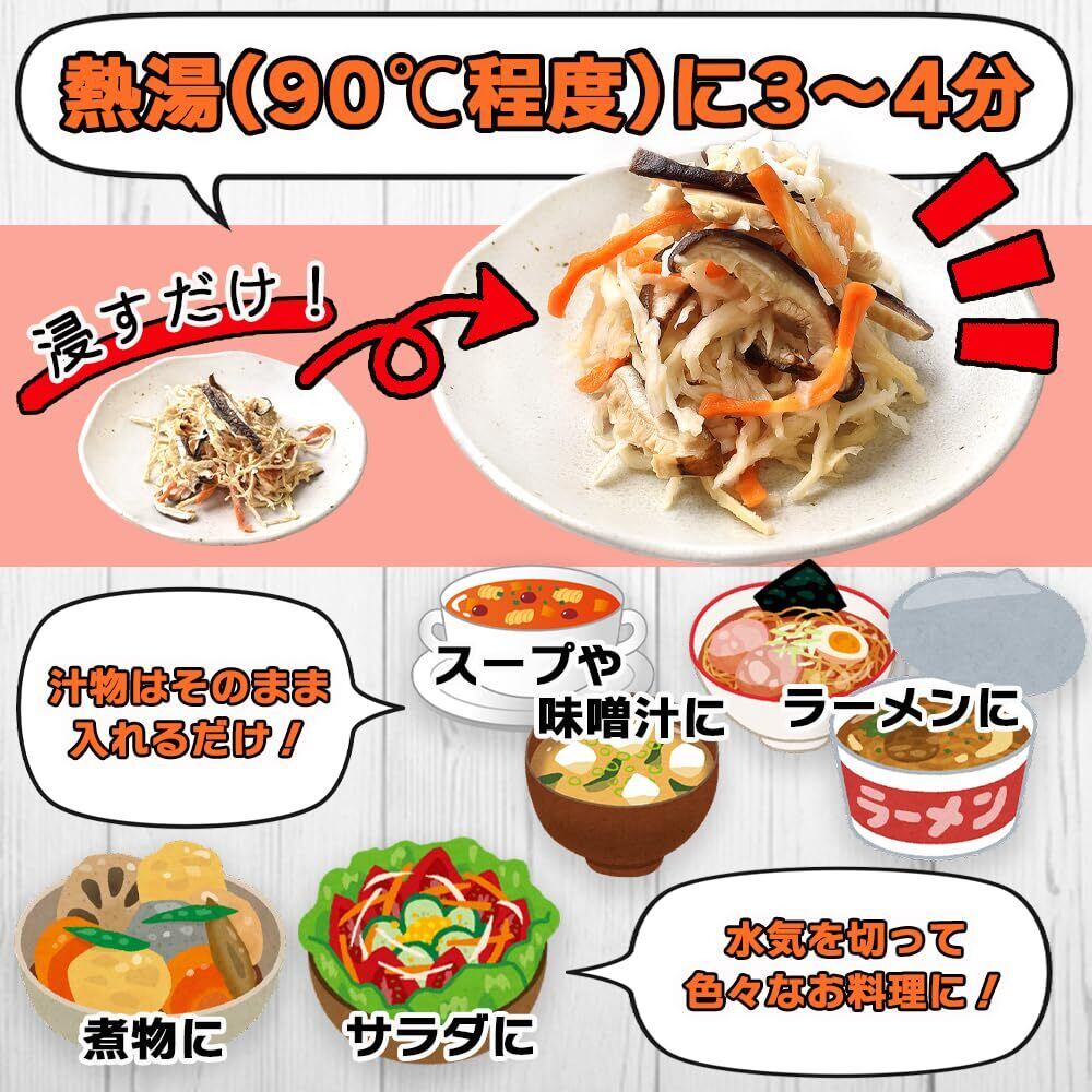 お召し上がり方:熱湯(90℃程度)で約3~4分浸して戻し、水気を切りそのまま食材として加熱調理やお料理の具材などにご利用くださいませ。レシピも考案頂いているので、是非一度ご賞味下さい。