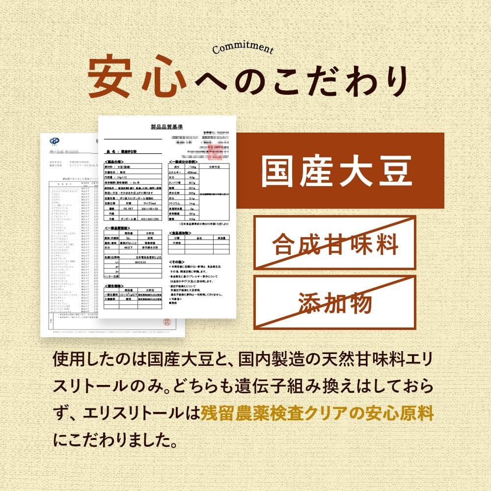 【安心へのこだわり】使用したのは国産大豆と、国内製造の天然甘味料エリストールのみ。どちらも遺伝子組み換えはしておらず、エリスリトールは残留農薬検査クリアの安心原料にこだわりました。