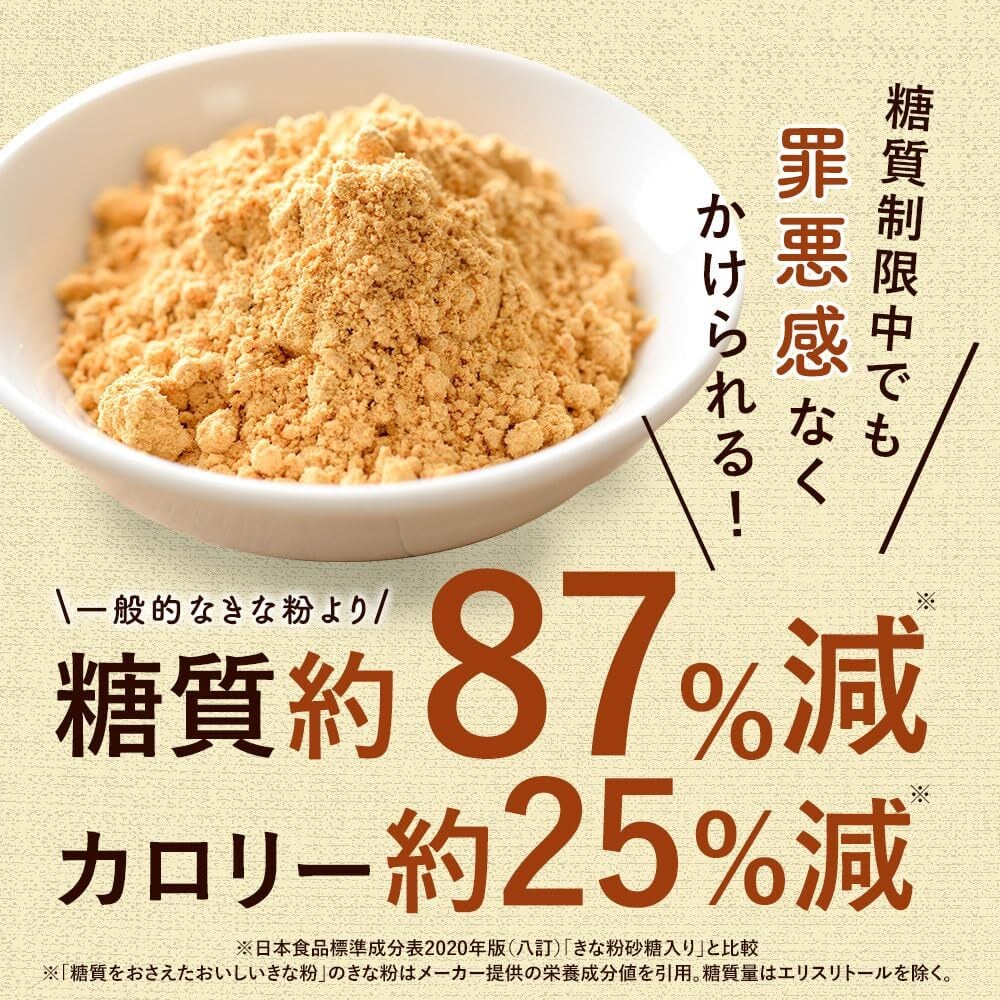 【国産大豆使用】香ばしい風味と素朴な甘み!甘いきな粉が大好きなダイエッターのために、罪悪感なく食べられる「糖質を抑えたおいしいきな粉」を考案。何度も試作し辿り着いた、自慢の黄金比のきな粉。【糖類不使用だけどちゃんと甘い】砂糖の代わりに糖類&カロリーゼロ甘味料「エリスリトール」を使用。エリスリトールは体内に吸収されても、そのほとんどが代謝されずに排出されるため、ゼロカロリーの甘味料として評価されています。すっきりとした甘さで糖質を抑えつつ満足感のある美味しさを実現。【安心へのこだわり】使用したのは国産大豆と、国内製造の天然甘味料エリストールのみ。どちらも遺伝子組み換えはしておらず、エリスリトールは残留農薬検査クリアの安心原料にこだわりました。【はじめようきな粉生活】煎った大豆を粉にしているため、きな粉には栄養素が多く含まれています。(たんぱく質/食物繊維/レシチン/サポニン/イソフラボン)女性や健康を気にしている方に積極的に取り入れてほしい食材のひとつです。