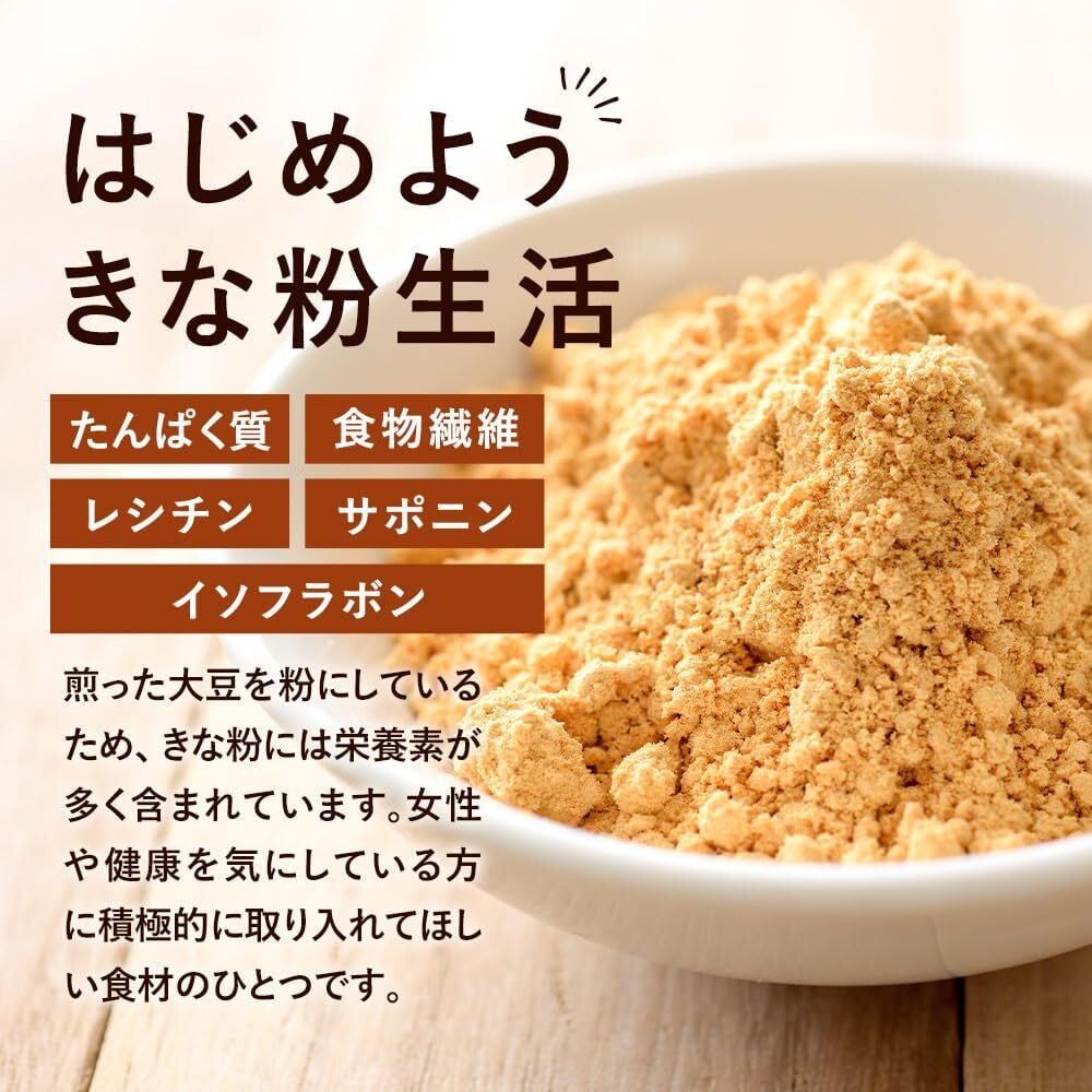 【はじめようきな粉生活】煎った大豆を粉にしているため、きな粉には栄養素が多く含まれています。(たんぱく質/食物繊維/レシチン/サポニン/イソフラボン)女性や健康を気にしている方に積極的に取り入れてほしい食材のひとつです。