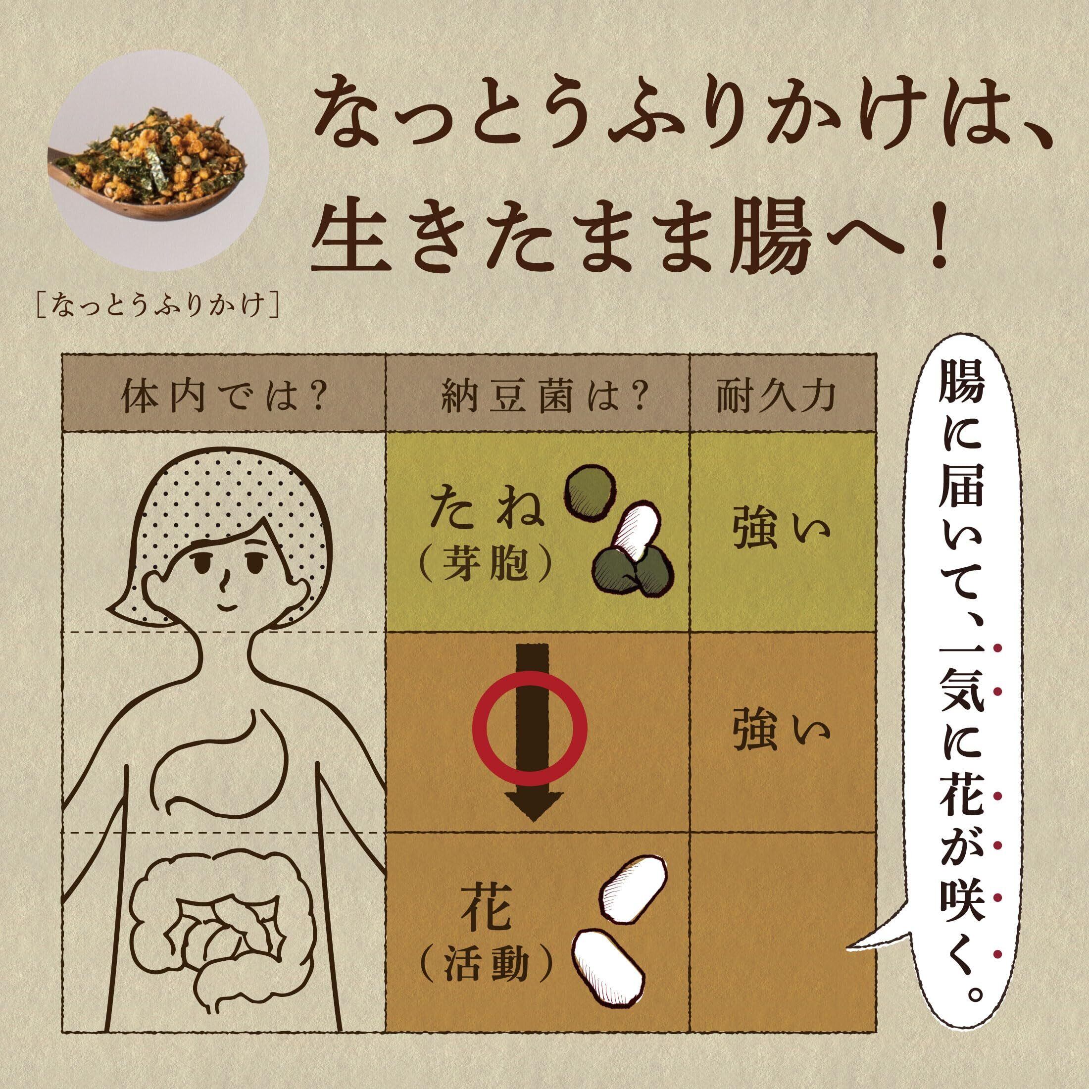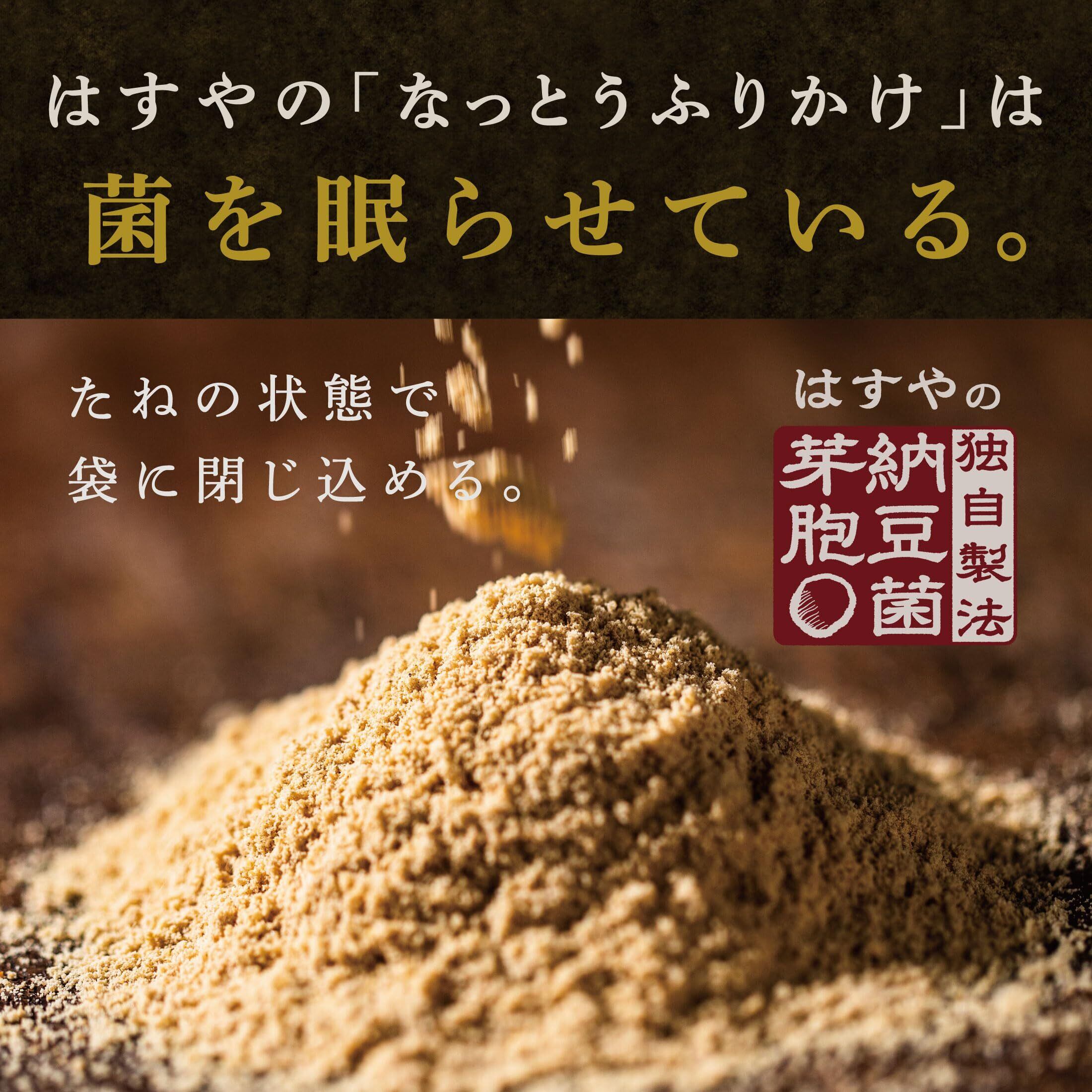 【納豆菌が活きている納豆ふりかけ】はすやの納豆ふりかけは独自製法の納豆菌芽胞により、納豆菌が活きて腸まで届き、腸内フローラを納豆菌がサポートします。