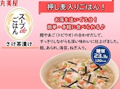 [ごはん]うるち米(国産)、大麦、なたね油/トレハロース、乳化剤、(一部に大豆を含む)|[具入りスープ]食塩、砂糖、鮭、鰹節粉、あられ、海苔、ねぎ、エキス(酵母、鮭)、乳糖、飛魚粉、昆布粉、鯵粉、デキストリン/調味料(アミノ酸等)、紅麹色素、酸化防止剤(ビタミンE)、(一部に乳成分・さけを含む)