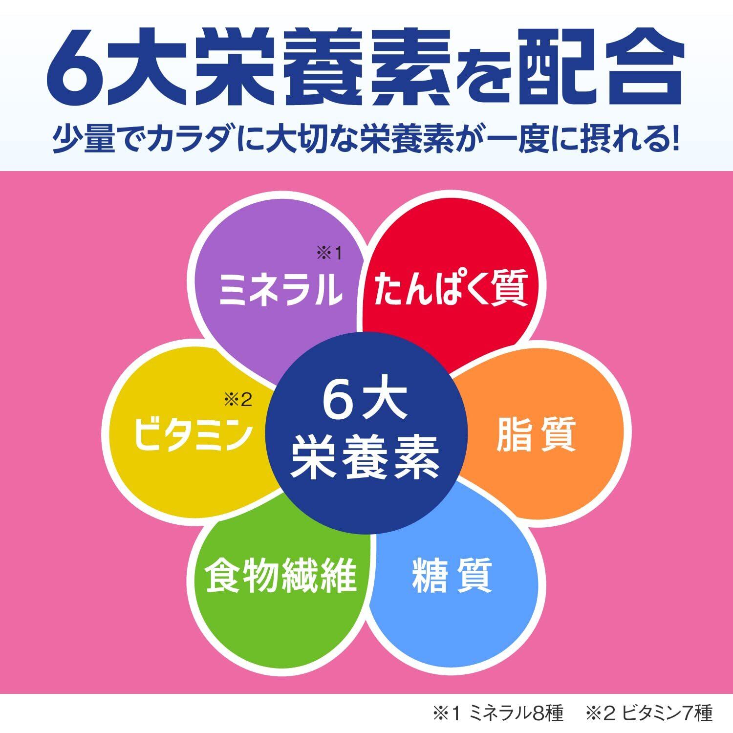 体に必要な6大栄養素(たんぱく質、脂質、糖質、食物繊維、ビタミン、ミネラル)をバランスよく配合しています。