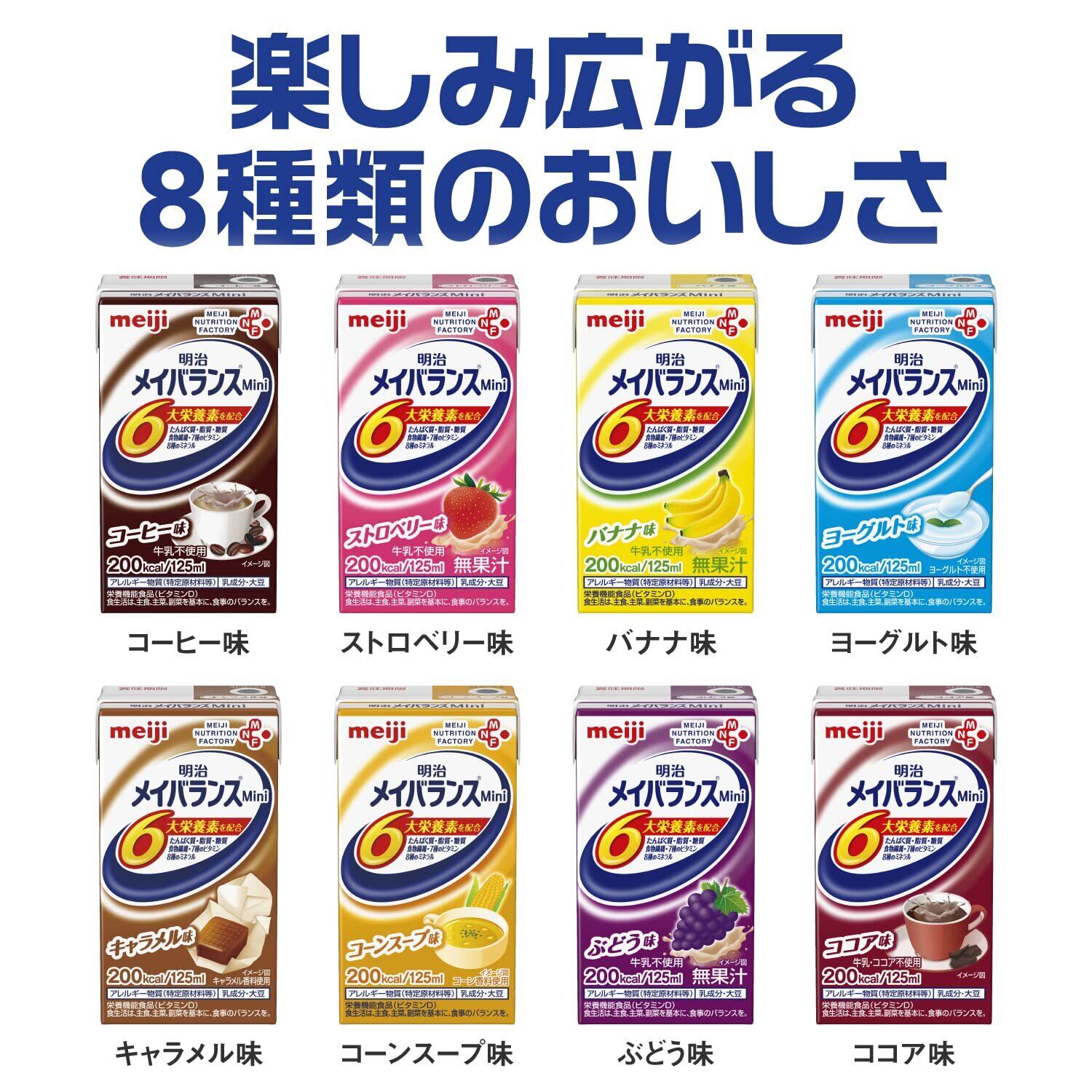●明治メイバランスMiniシリーズは、通常の食品だけでは十分な栄養が摂れない方の、食事をサポートする食品です。●食べることを楽しんでいただきたいという想いから、おいしさと食べやすさにこだわっています。●1本200kcal/125mlの少量で高エネルギー設計●バランスの良い栄養組成(脂質エネルギー比25.2%)●1本当たりたんぱく質7.5g、亜鉛2.0mg、食物繊維2.5gを配合●11種類のビタミン配合●8種の味で飽きずに飲むことができます。